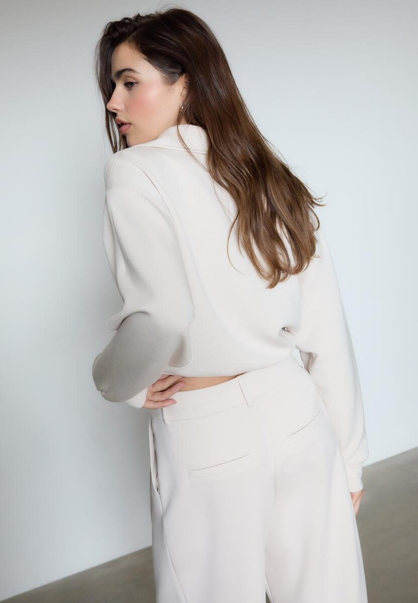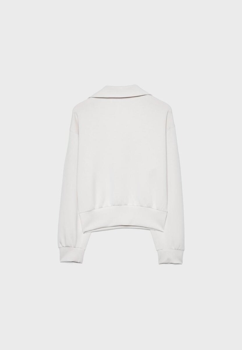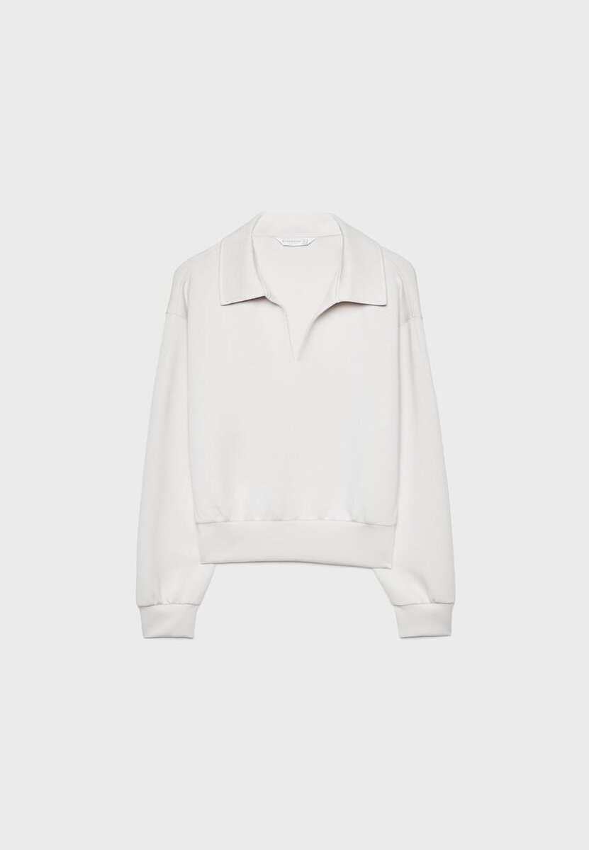 Mikina Jemné na dotek. Límec s klopami a výstřih do V, dlouhé rukávy a elastické manžety. K dispozici v různých barvách.