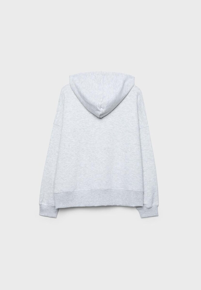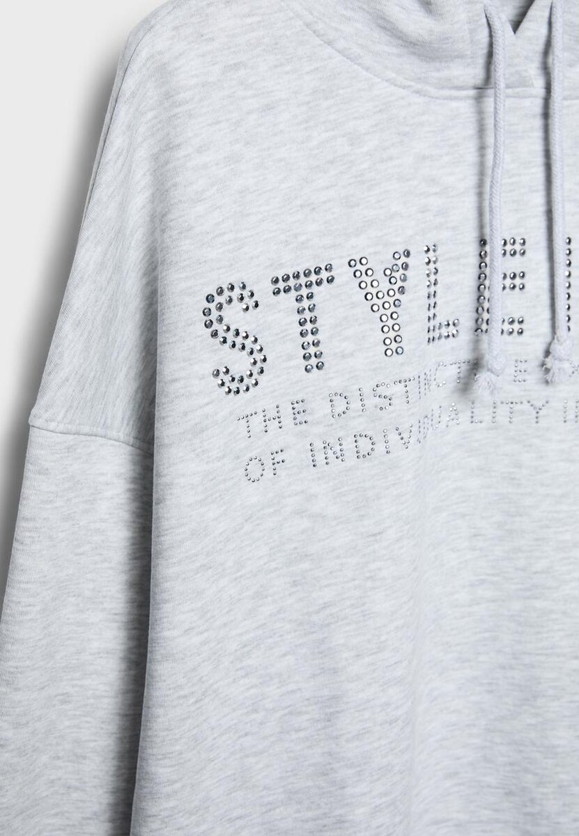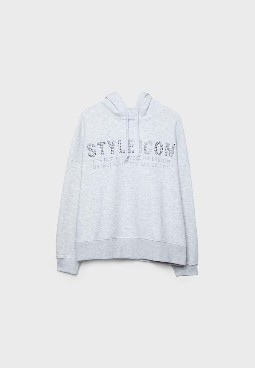 Mikina s nastavitelnou kapucí na stahovací šňůrku. Dlouhé rukávy s žebrovanými manžetami a lemem. Na přední straně s potiskem z kamínků.