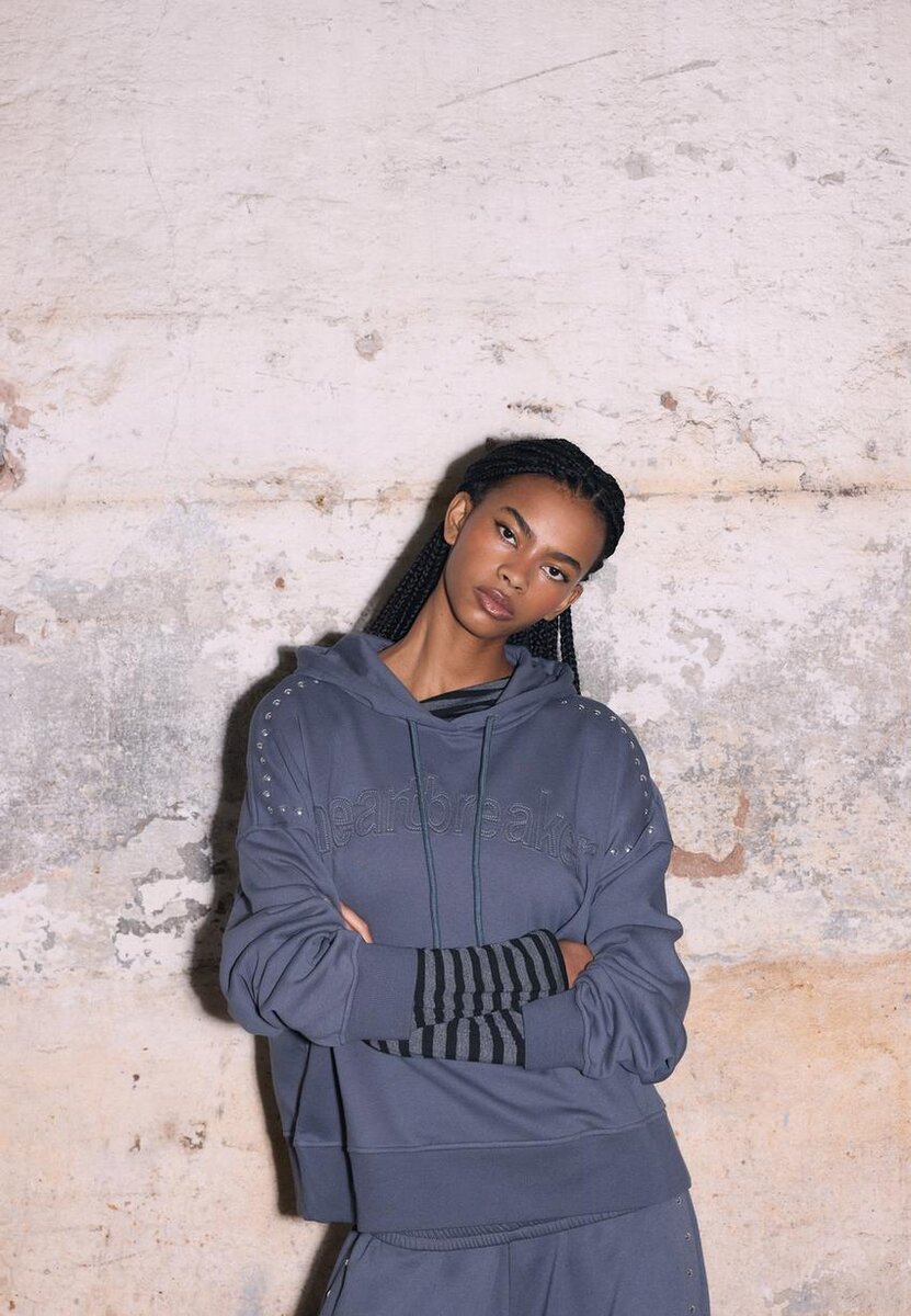 Mikina s kapucí s nastavitelnou stahovací šňůrkou. Dlouhé rukávy. Žebrované lemy. Cvočky na rameni a výšivka na přední straně.