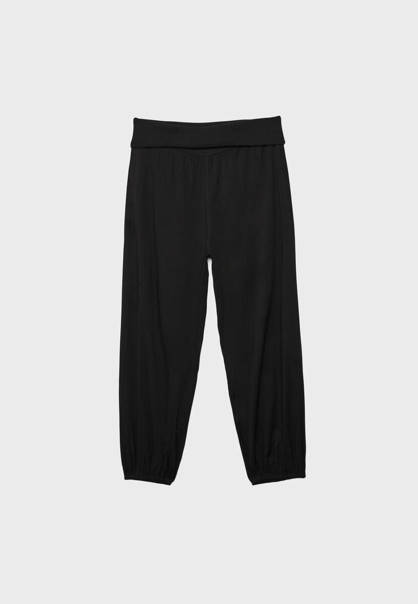 Kalhoty s ohrnutým pasem. Mají elastické manžety. K dispozici v několika barvách.