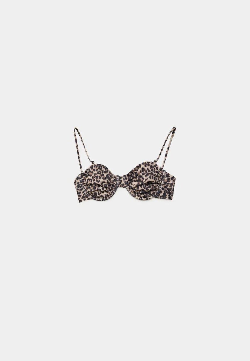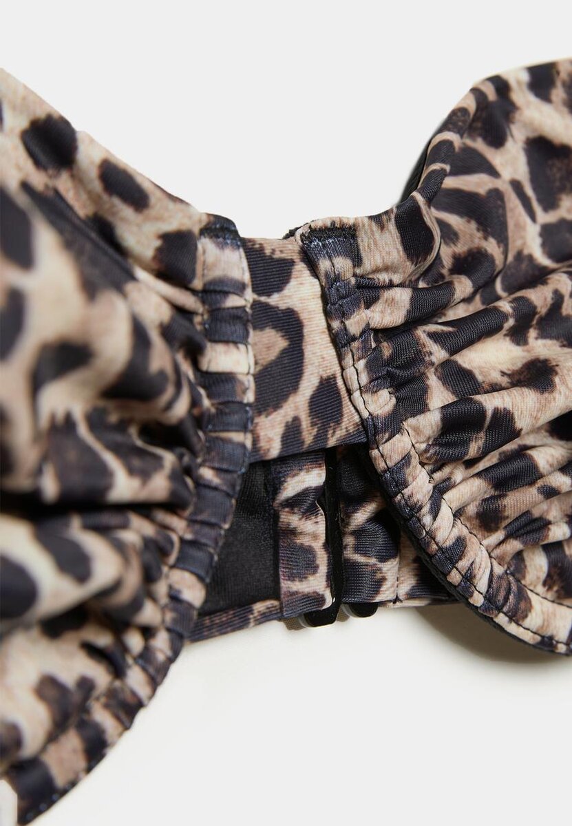 Bikiny s balonkovým střihem vyrobené z látky se zvířecím potiskem. Mají nastavitelné ramínka a nastavitelné zapínání na háčky na zádech.