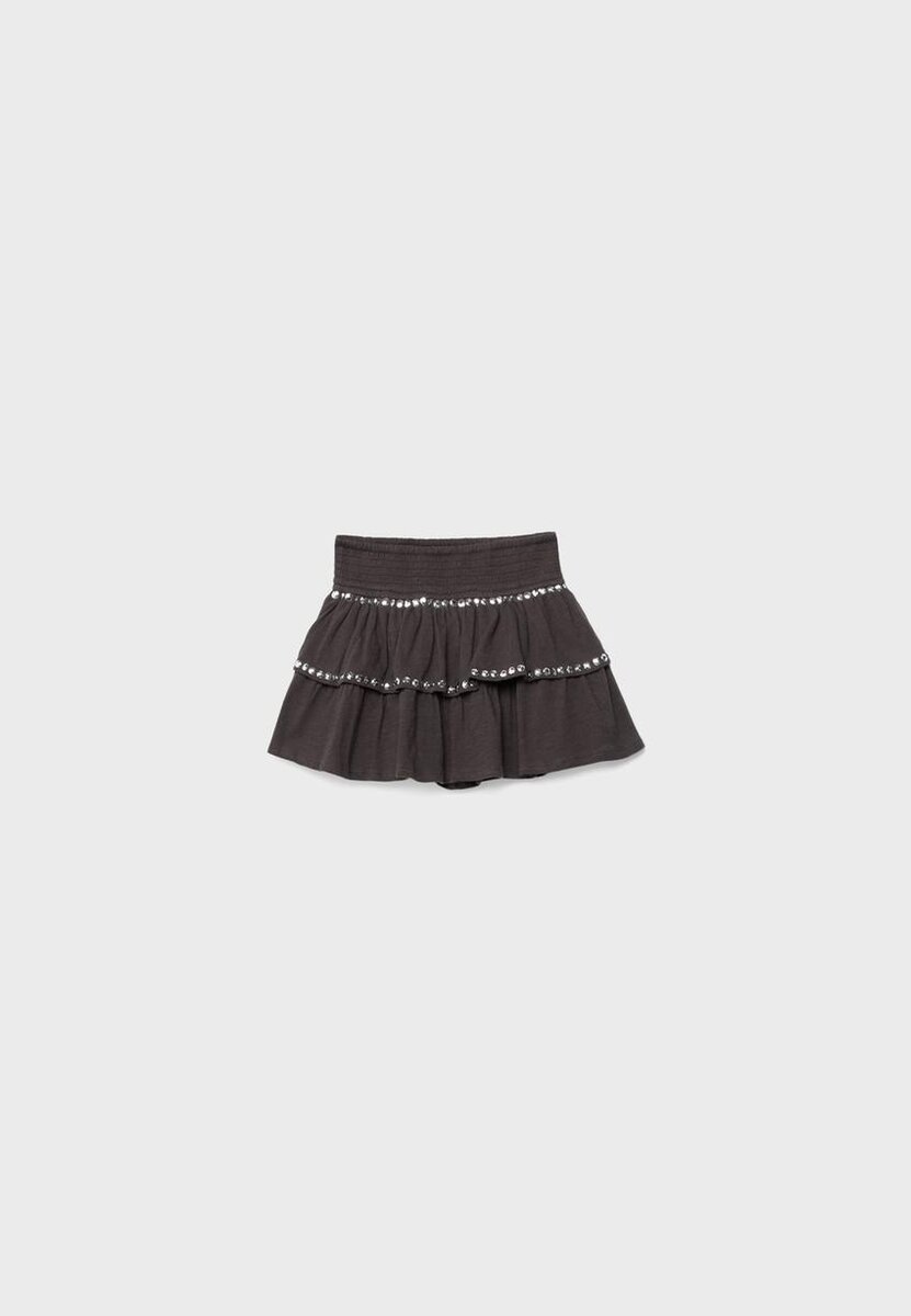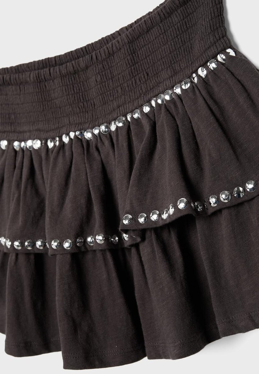 Mini sukně s elastickým smockovaným pasem. S volánkovým lemem s cvočky a ladícími vnitřními kraťasy. K dispozici v různých barvách.