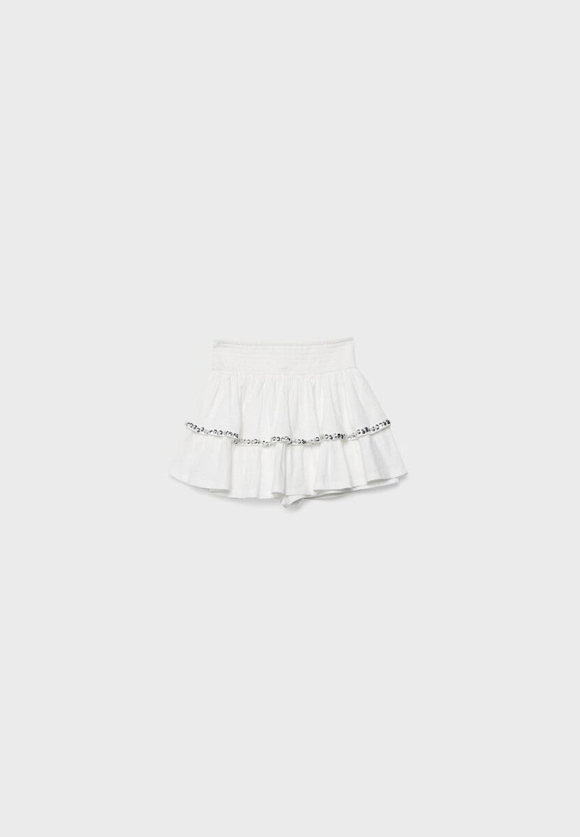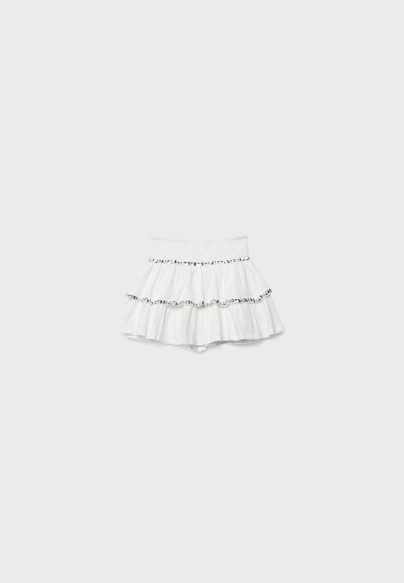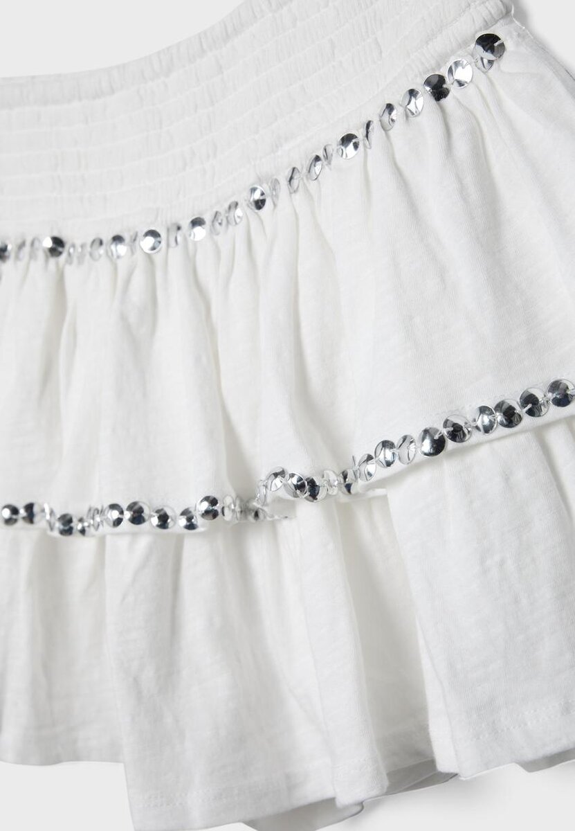 Mini sukně s elastickým smockovaným pasem, volánkovým lemem s cvočky a ladícími kraťasy. K dispozici v různých barvách.