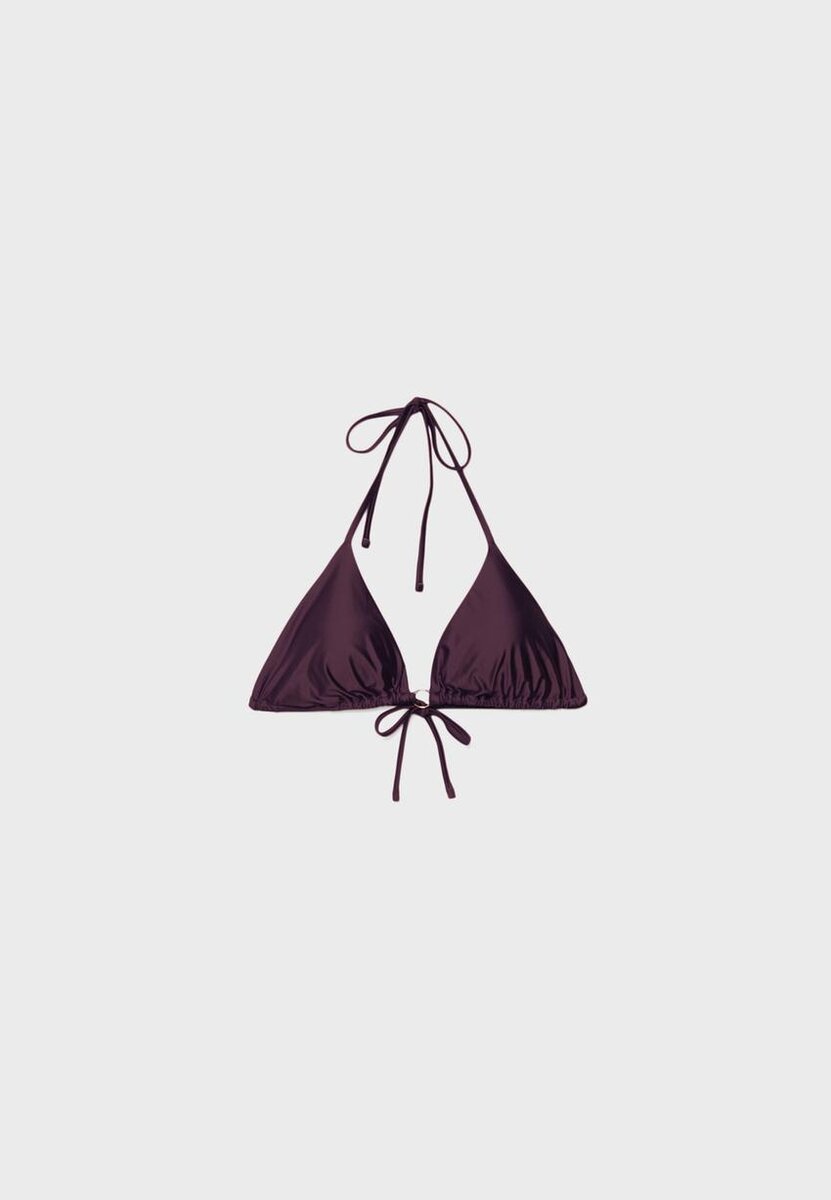 Nastavitelné trojúhelníkové bikiny s vázáním za krkem a na zádech, vyrobené z látky se saténovým efektem.