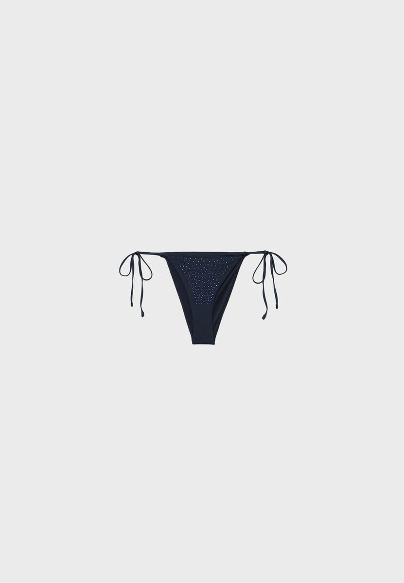 Nastavitelné bikiny s vázáním na bocích a ozdobami z kamínků. K dispozici v různých barvách.