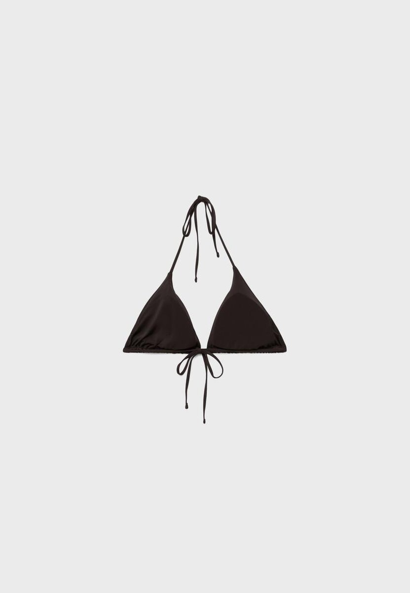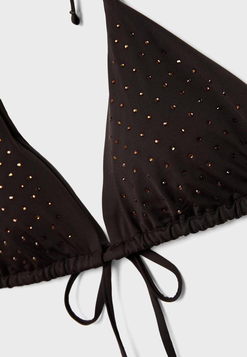 Top k bikinám vyrobený z třpytivé látky. Má výstřih do V a tenká ramínka, která se zavazují za krkem. Zdobený kamínky. Zapíná se na zavazování vzadu. K dispozici v několika barvách.