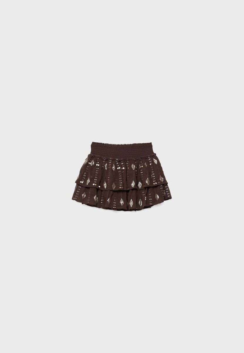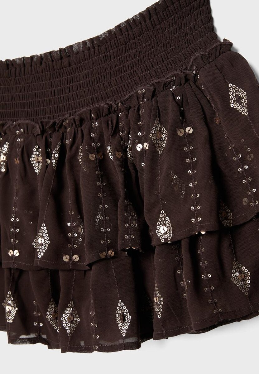Minisukně s elastickým smockovaným pasem. S volánkovým lemem a korálkovou výšivkou. K dispozici v různých barvách.