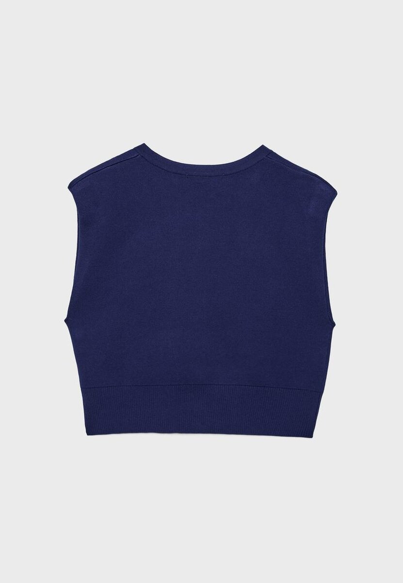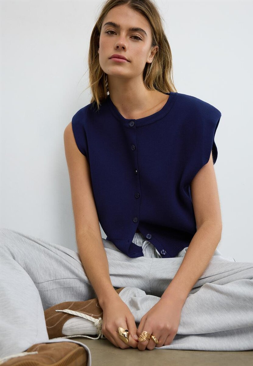 Pletená vesta s kulatým výstřihem, bez rukávů a s vycpávkami na ramenou. Žebrované lemy. Zapínání na knoflíky vpředu. K dispozici v několika barvách.