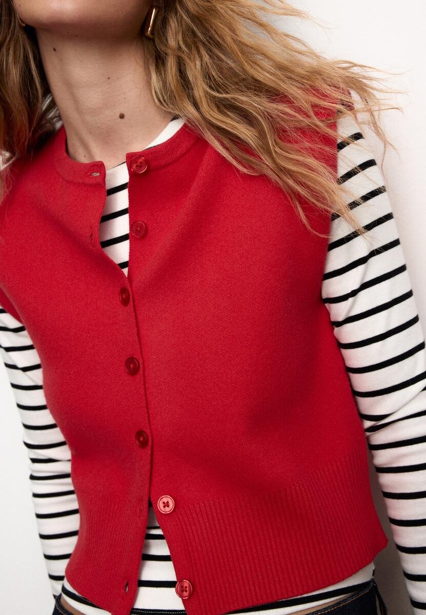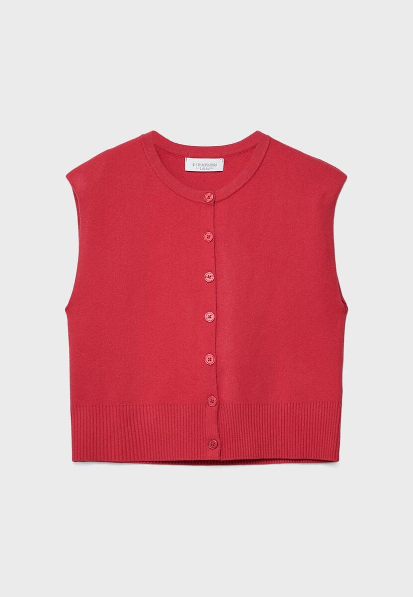 Jednobarevná pletená vesta s kulatým výstřihem, bez rukávů a s vycpávkami na ramenou. Žebrovaný lem. Zapínání na knoflíky vpředu.
