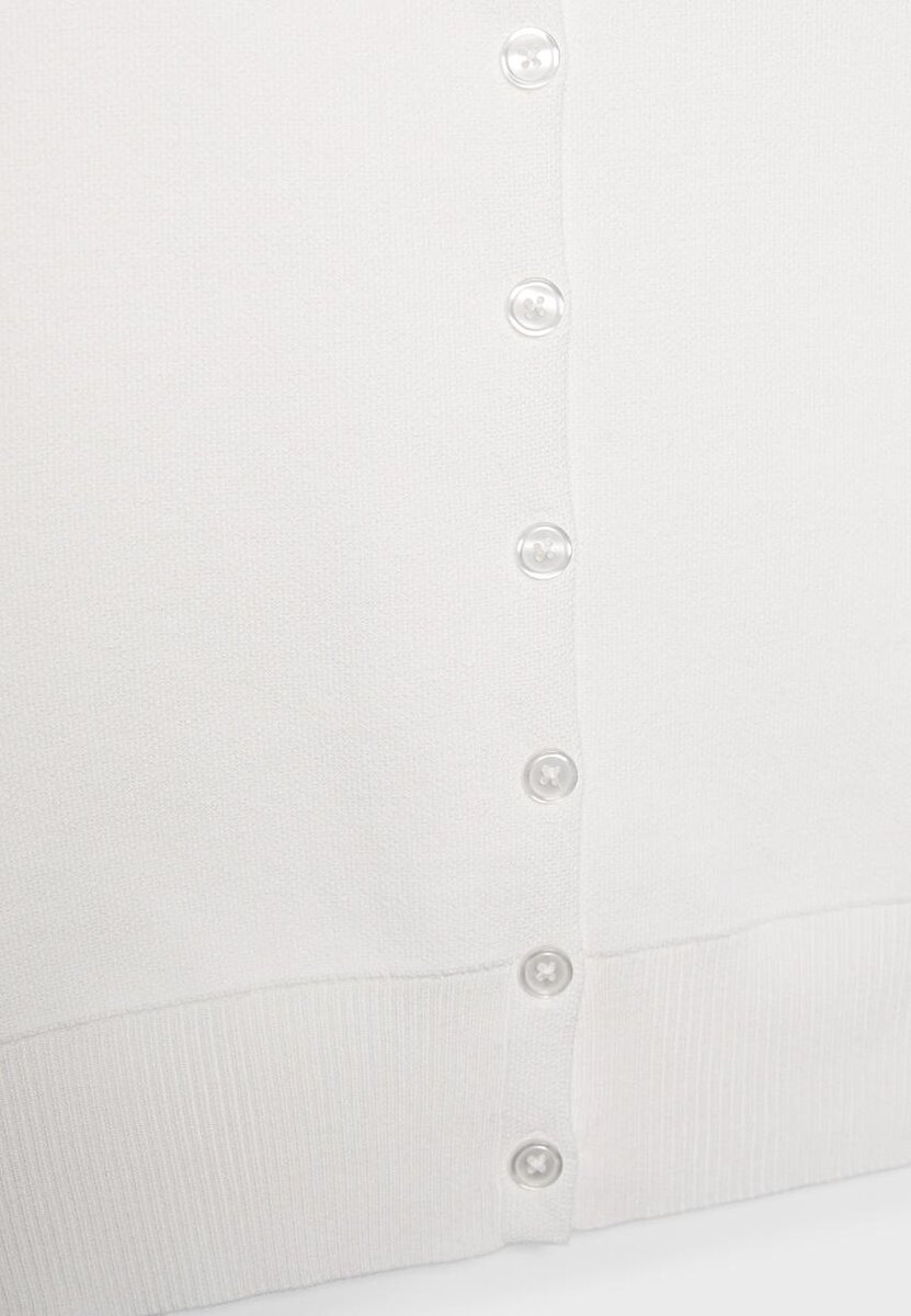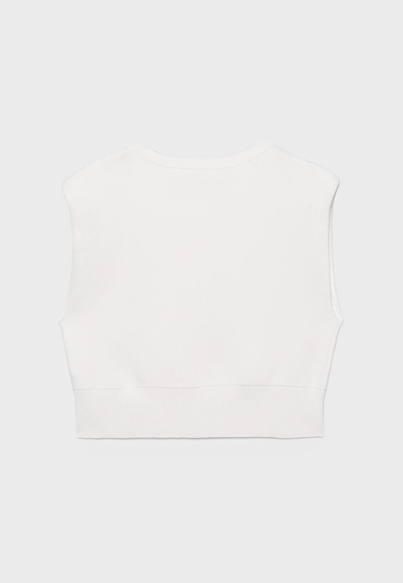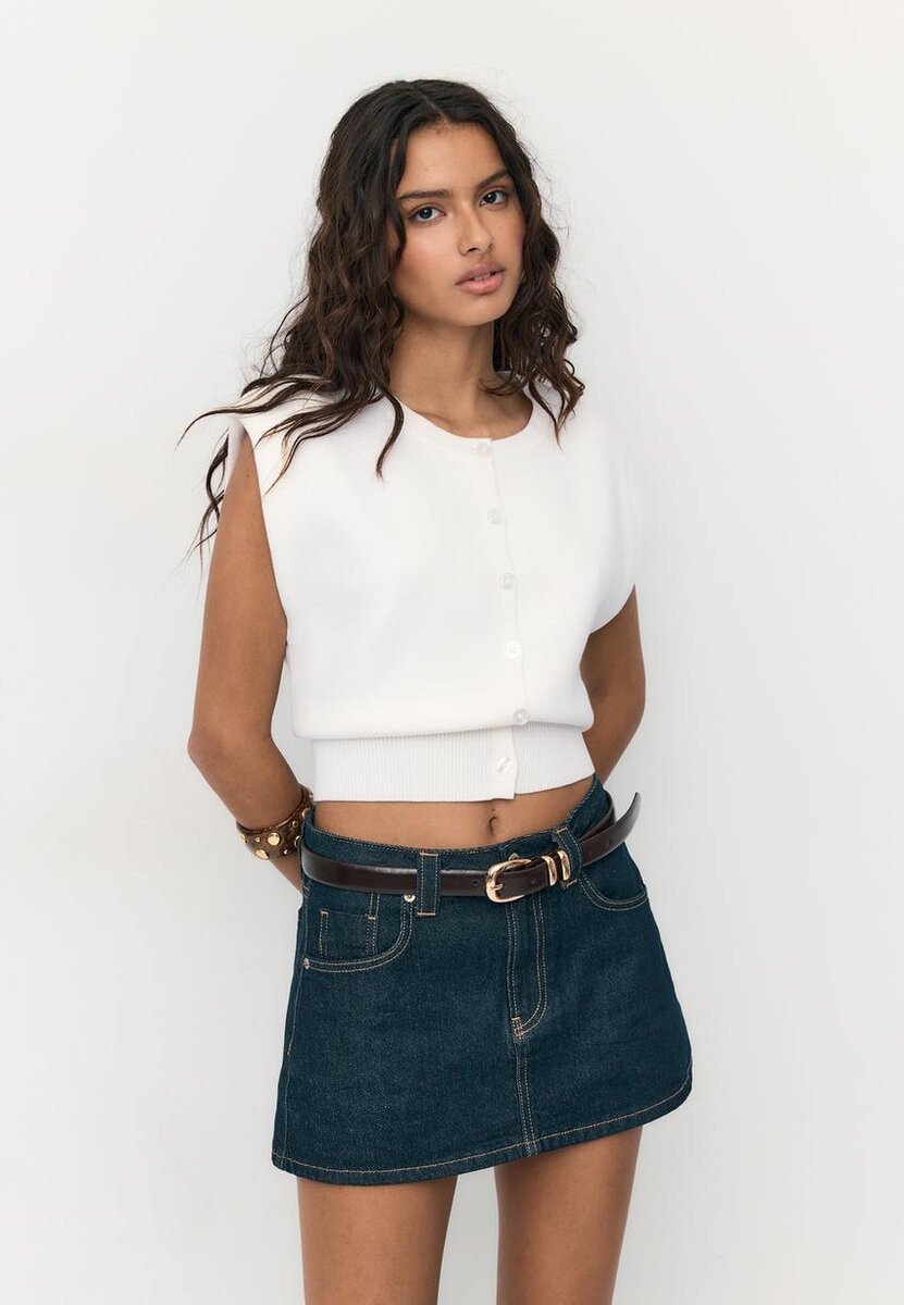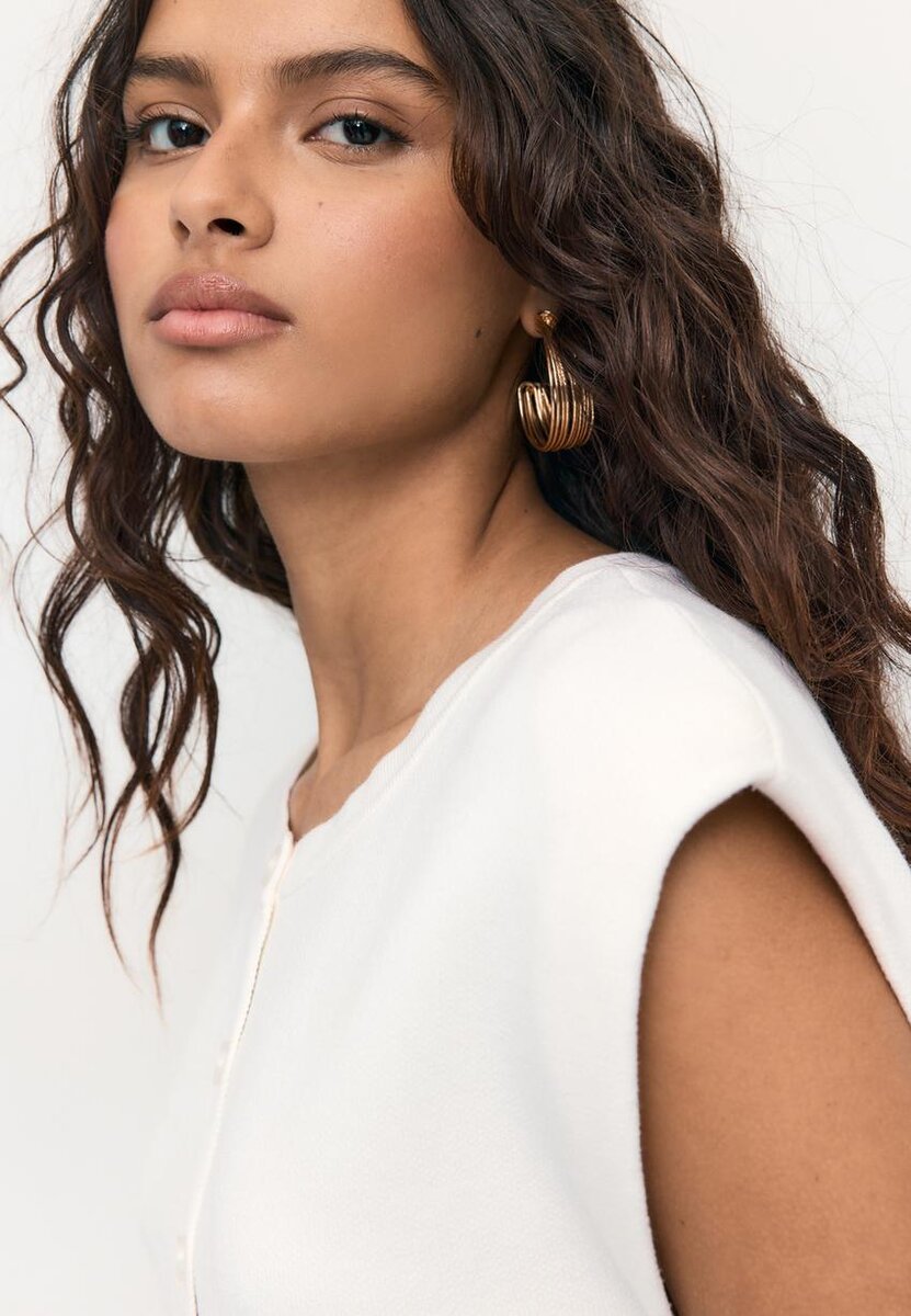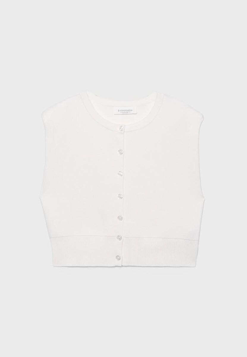 Pletená vesta s kulatým výstřihem a vycpávkami na ramenou. Žebrované lemy. Zapínání na knoflíky vpředu. K dispozici v několika barvách.
