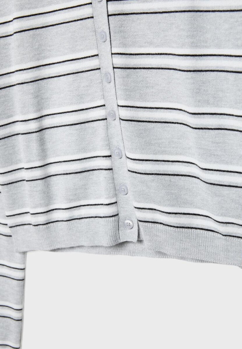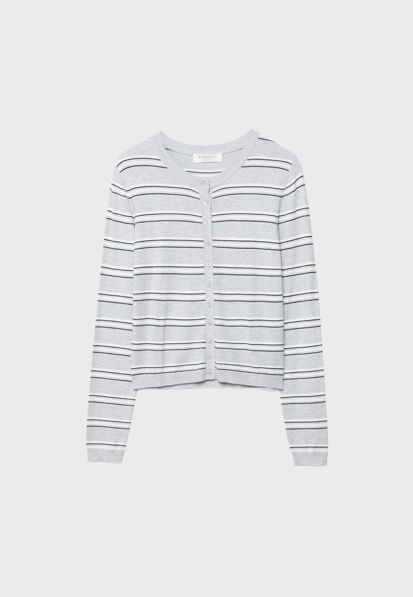 Pletený kardigan s kulatým výstřihem a regular střihem. Dlouhé rukávy. Žebrovaný lem u krku a na manžetách. Zapínání na knoflíky vpředu. K dispozici v několika barvách.