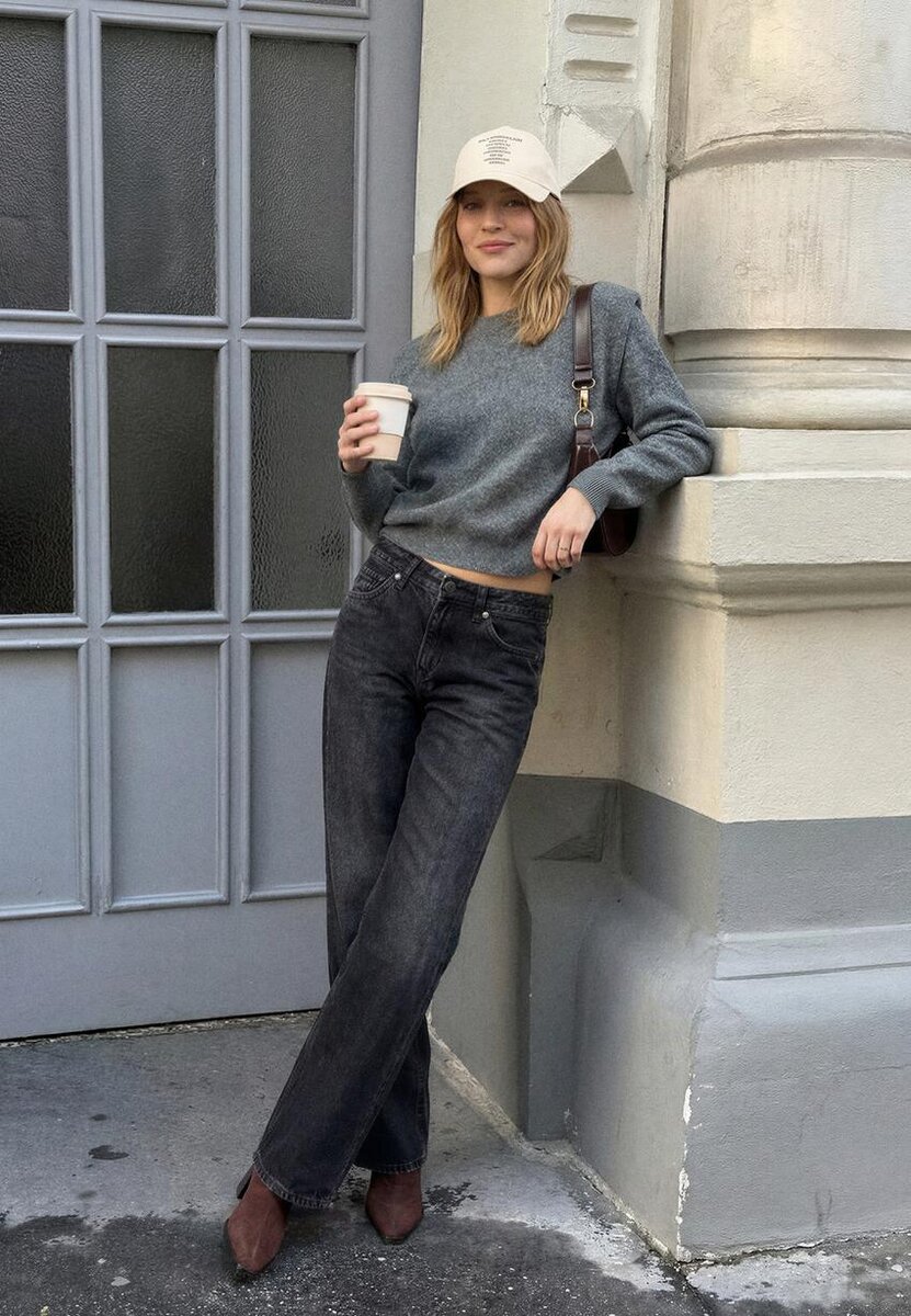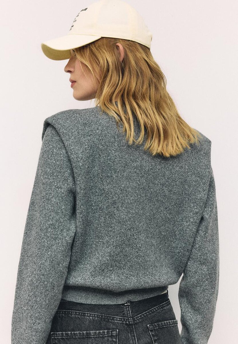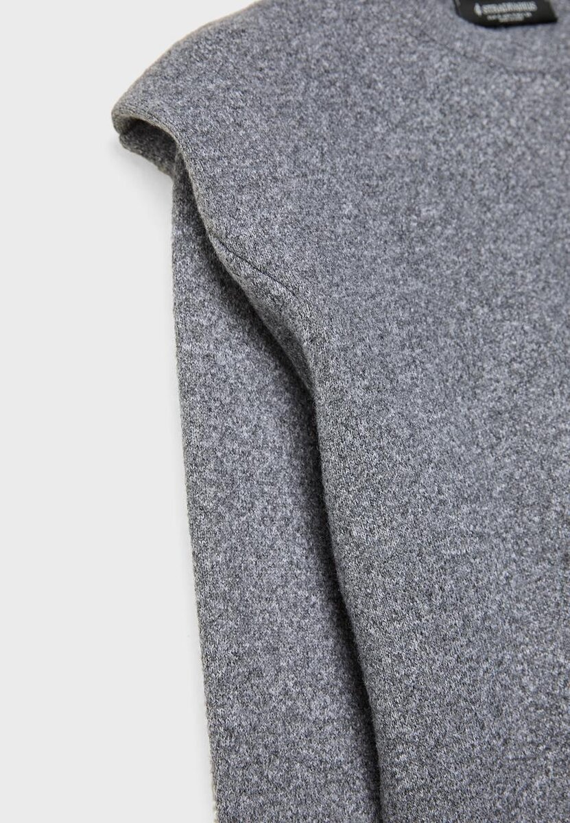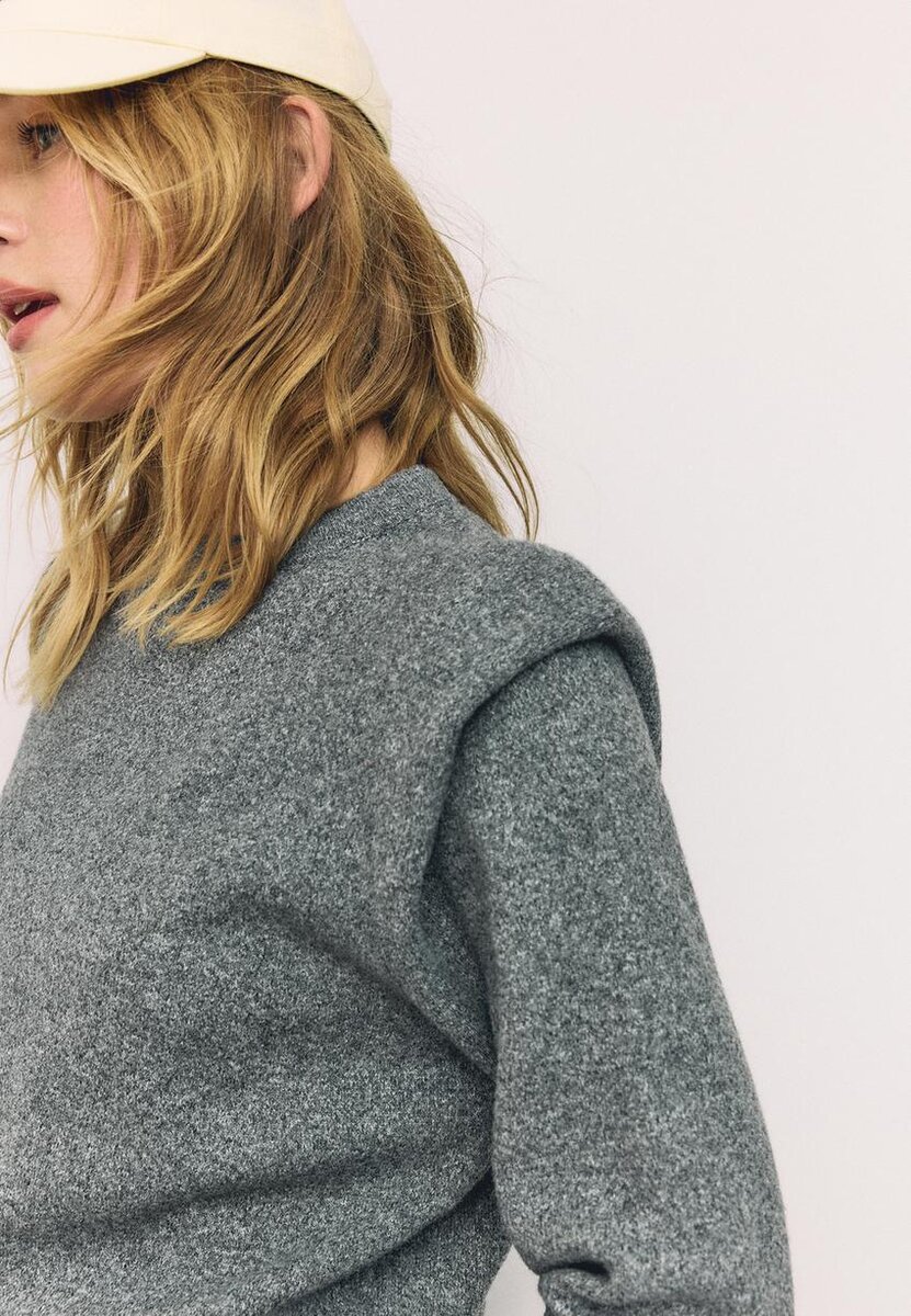 Jednobarevný pletený svetr s kulatým výstřihem. Dlouhé rukávy s elastickými manžetami, drapované detaily a vycpaná ramena. Žebrované lemy.