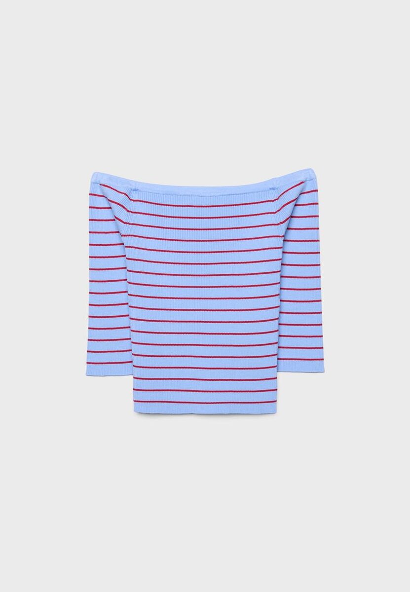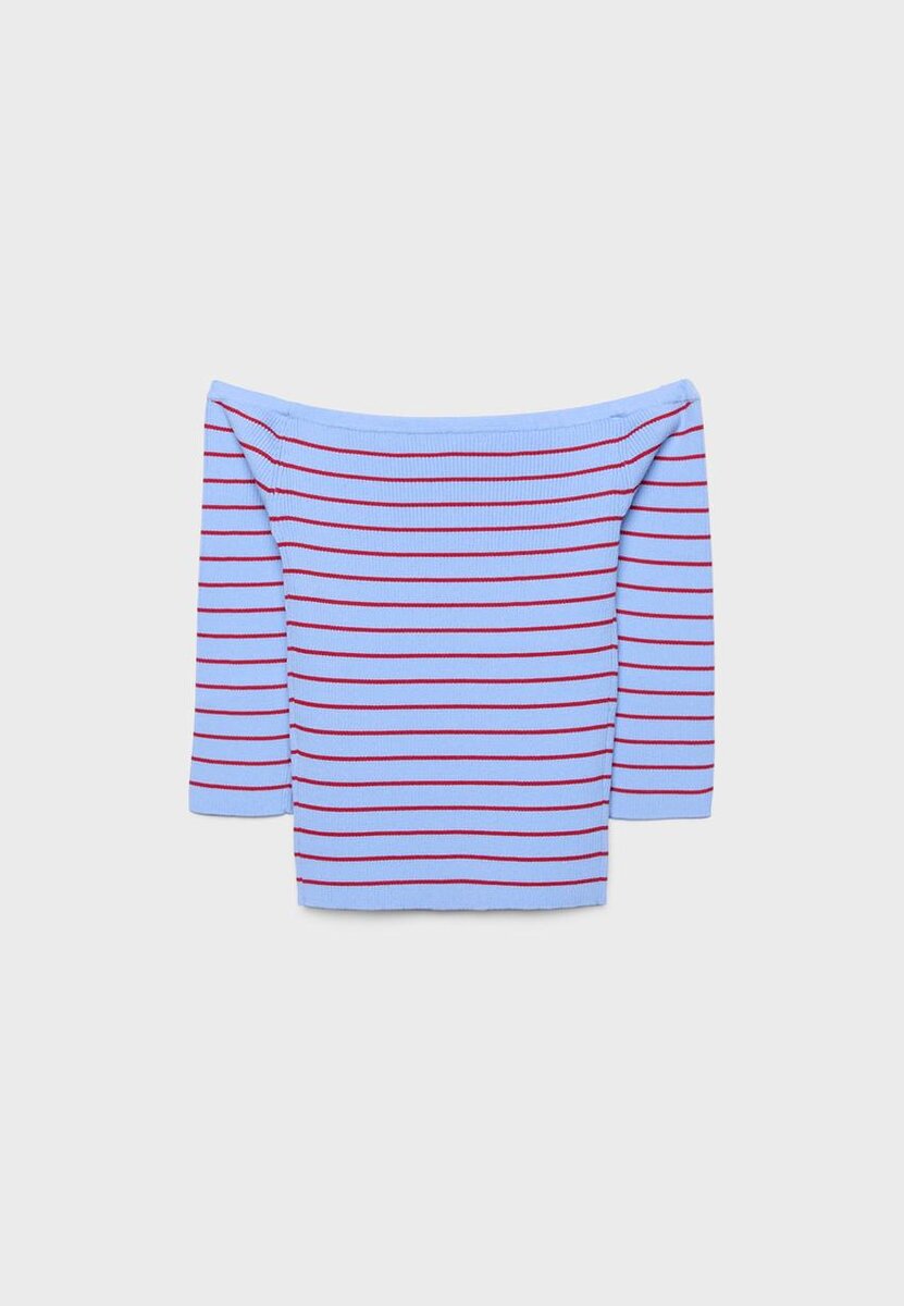Přiléhavý pletený svetr. S lodním výstřihem a rukávy po lokty s odhalenými rameny.