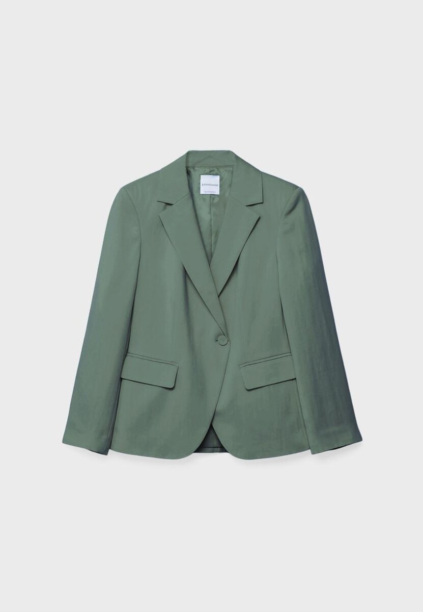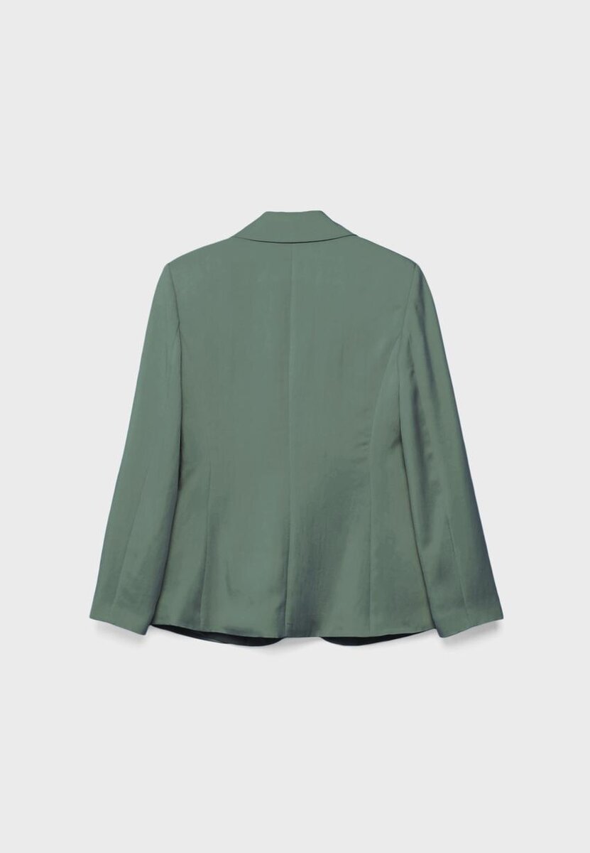 Saka s rovným střihem vyrobený ze směsové tkaniny z lyocellu a viskózy. Má klopový límec s špičatými klopami a dlouhé rukávy. Přední kapsy s klopou. Asymetrické zapínání na knoflíky vpředu.