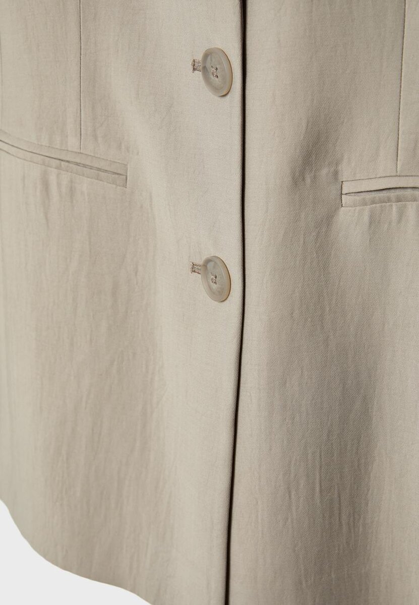 Přiléhavé sako vyrobené z viskózové směsi. Má klopový límec a dlouhé rukávy. Přední kapsy s klopami a detail kapsy s lemováním na hrudi. Zapínání na tři knoflíky vpředu.