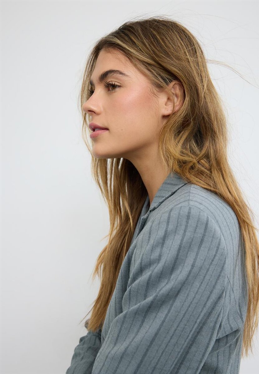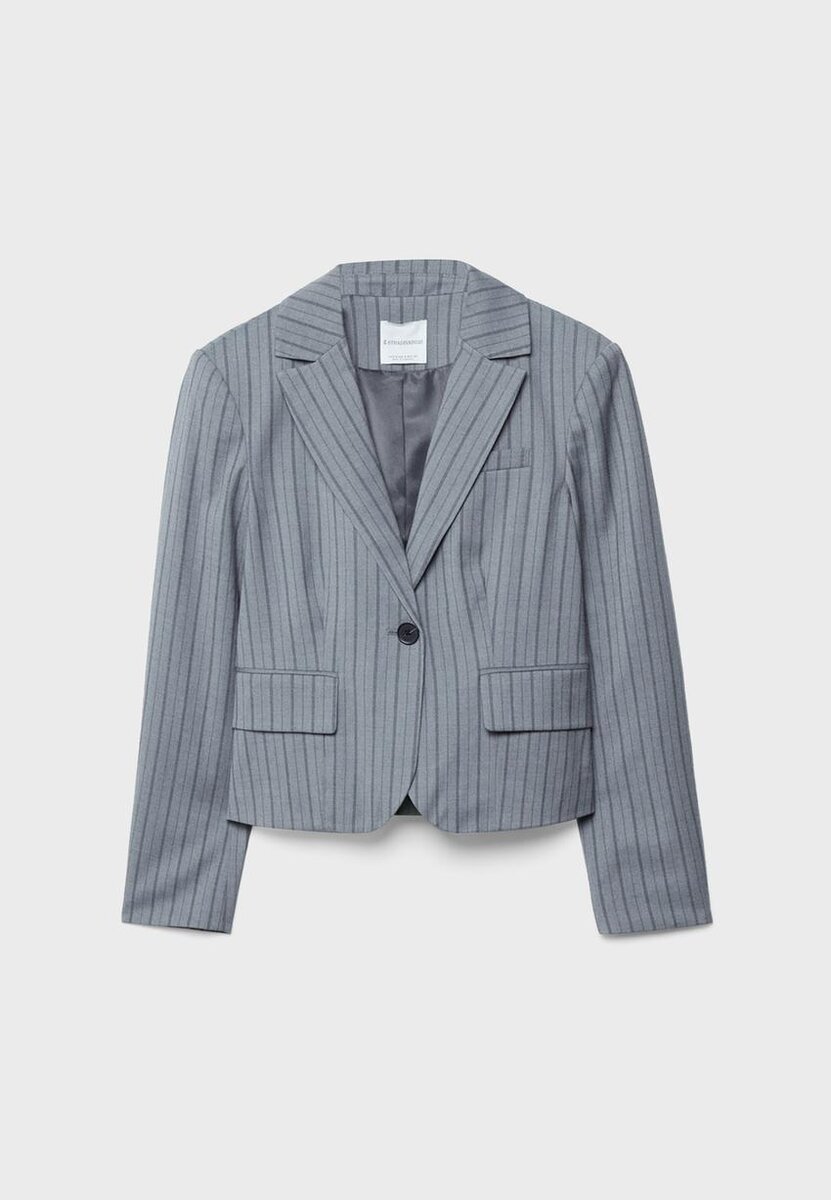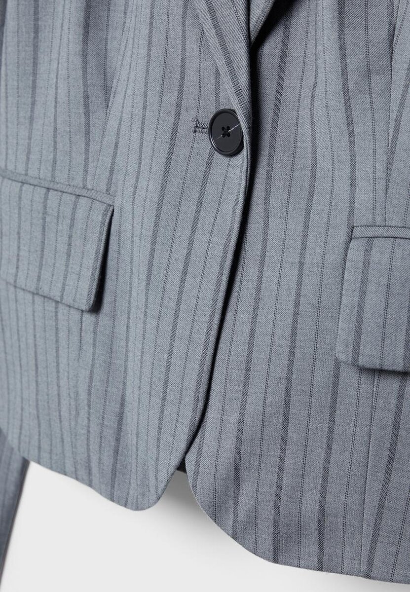 Krátký blejzr vyrobený z pružné viskózové směsi pro větší pohodlí a volnost pohybu. S klopovým límcem a dlouhými flared rukávy. Kapsy s klopami na přední straně. Zapínání na knoflíky vpředu.