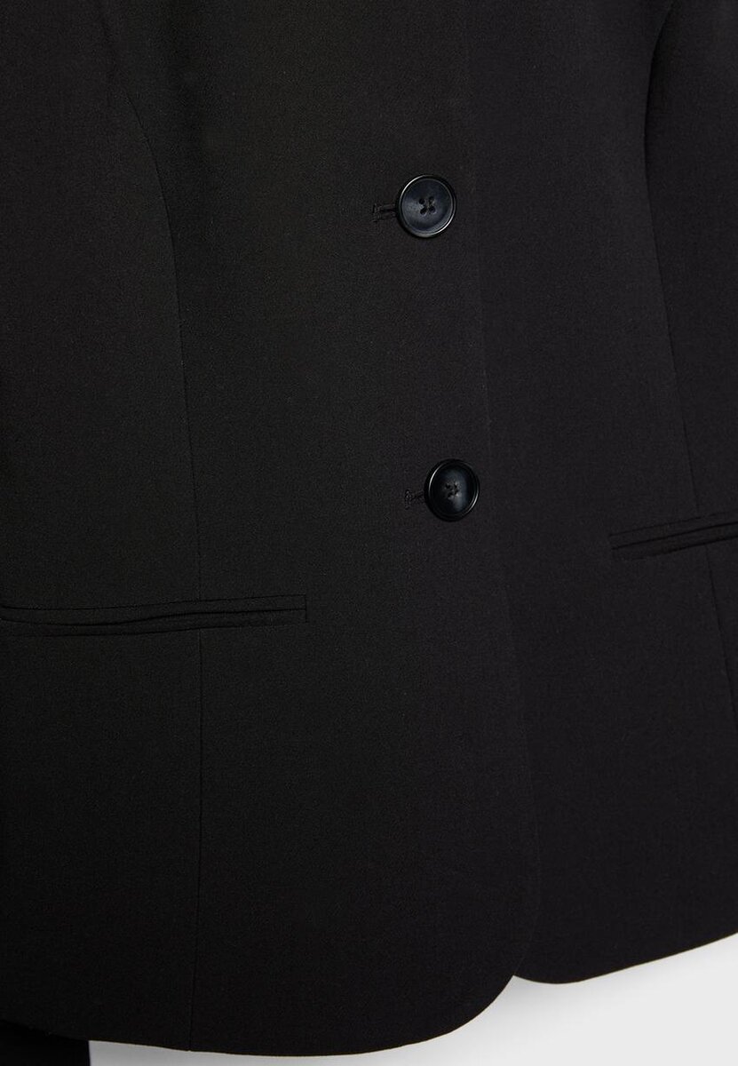 Sako standardní délky. S kulatým výstřihem a dlouhými rukávy. Přední kapsy s lemováním. Zapínání na knoflíky vpředu.