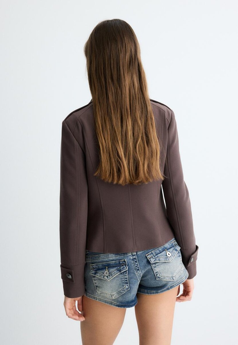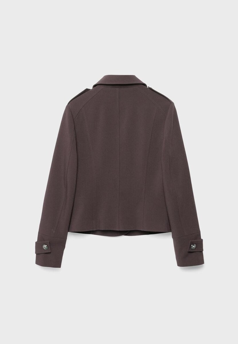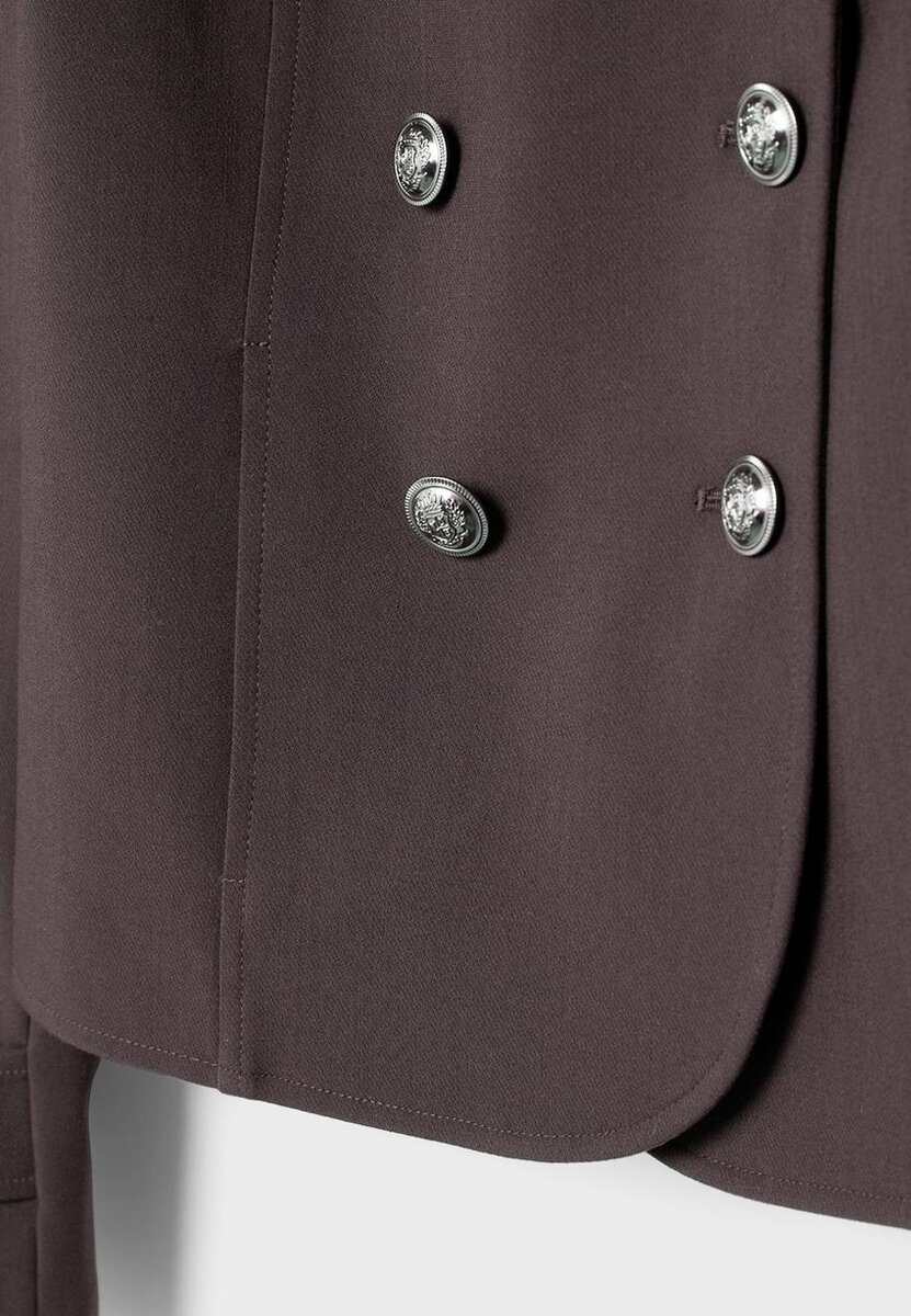 Přiléhavé sako s klopovým límcem a dlouhými rukávy s poutkem a gravírovaným knoflíkem. Přední kapsy. Zapínání na knoflíky vpředu. Páska na vycpaných ramenou s gravírovaným knoflíkem.