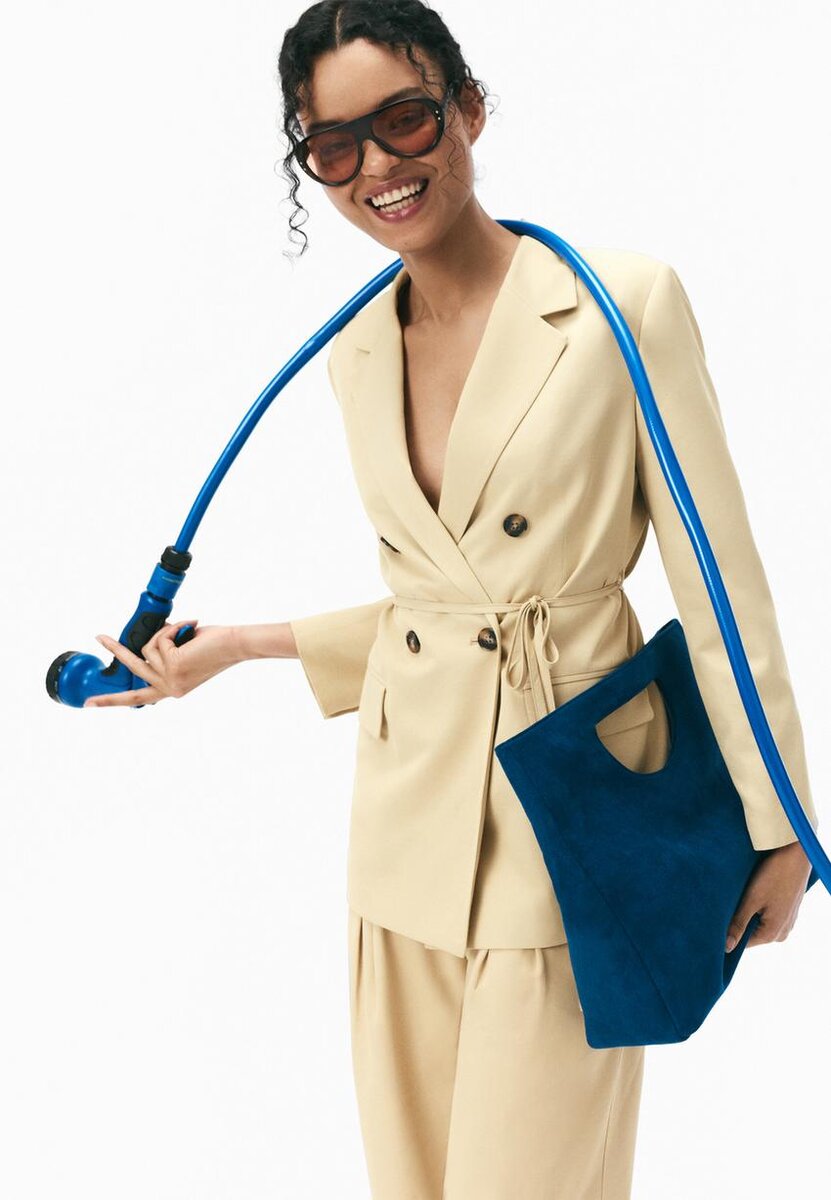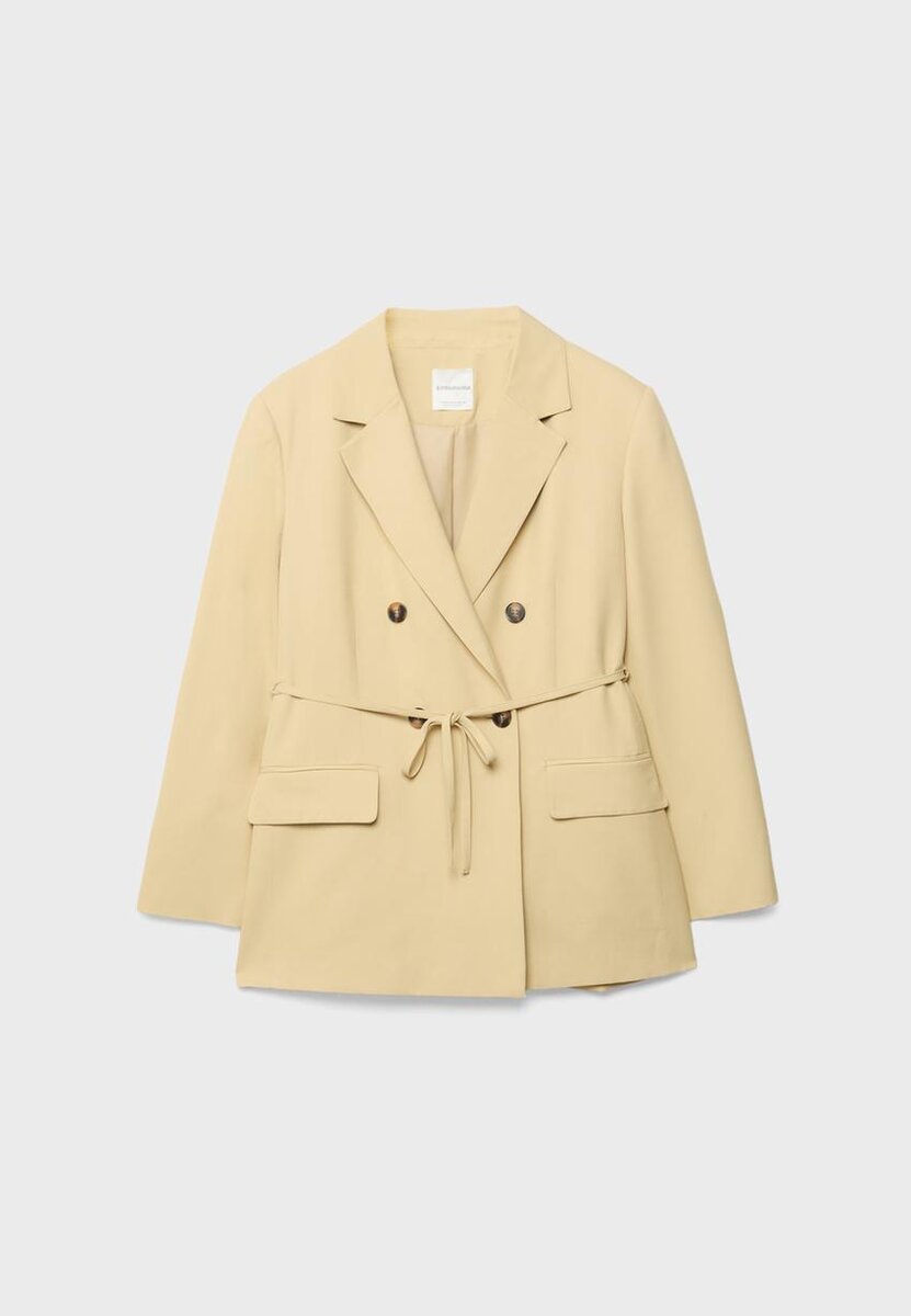 Sako rovného střihu, po boky, vyrobené z viskózové tkaniny. S klopovým límcem a dlouhými rukávy s ramenními vycpávkami. Falešné klopové kapsy na přední straně. Dvouřadé zapínání na knoflíky a ladící látkový opasek na zavázání.