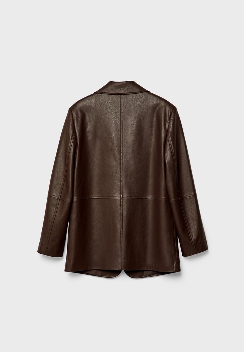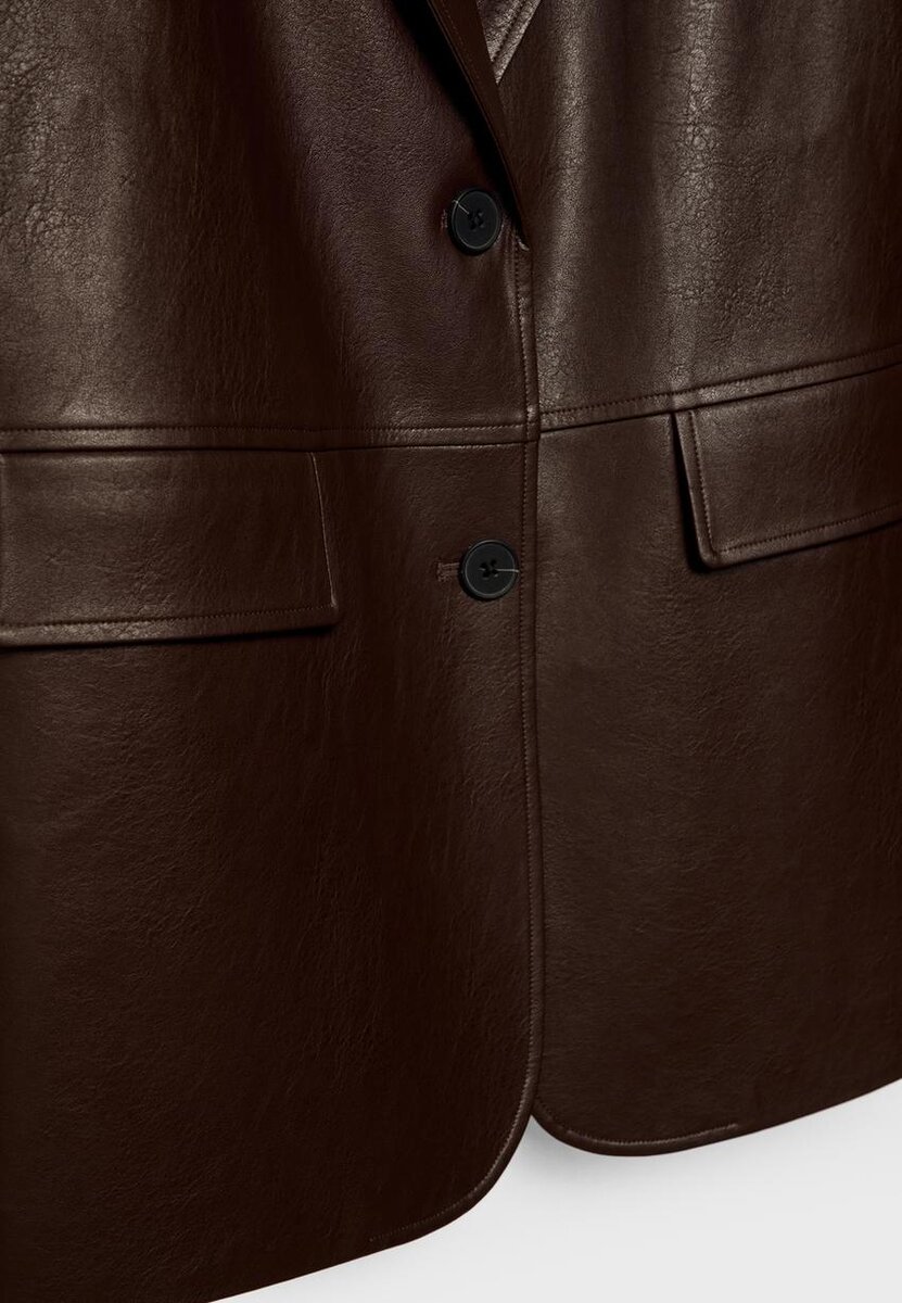 Sako z materiálu s efektem kůže. Límec s klopami a dlouhé rukávy. Přední kapsy s klopou. Zapínání na knoflíky vpředu.