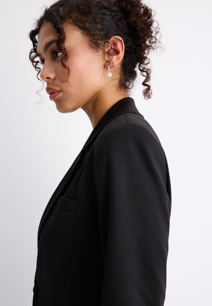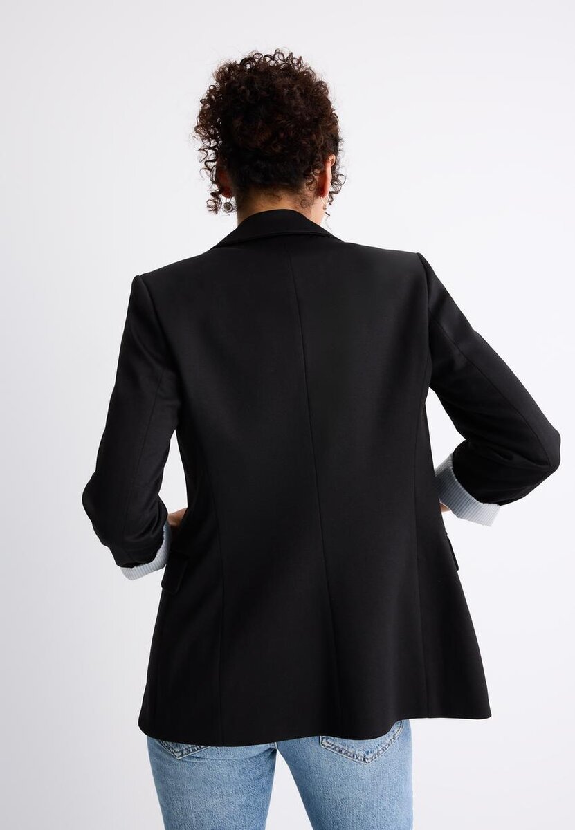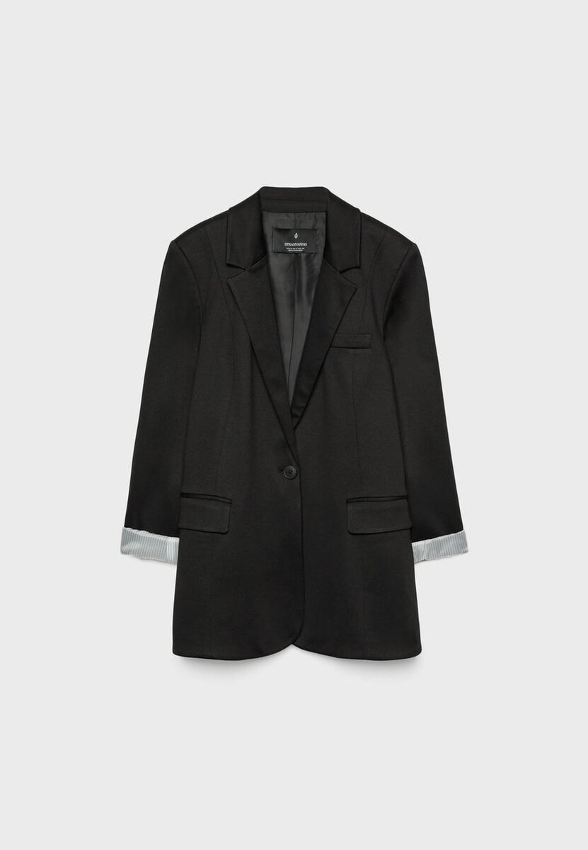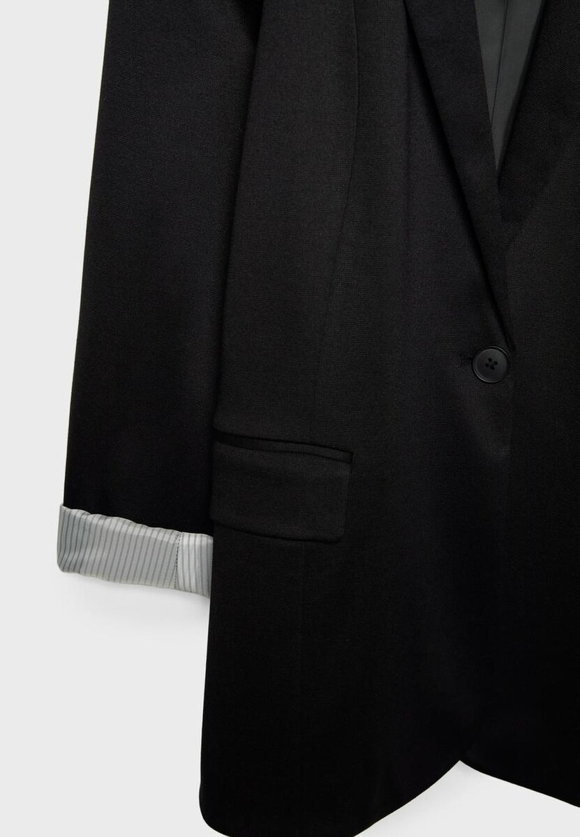 Sako s klopovým límcem a dlouhými vyhrnutými rukávy s pruhovanou podšívkou. S předními kapsami s klopou a zapínáním na knoflíky vpředu.