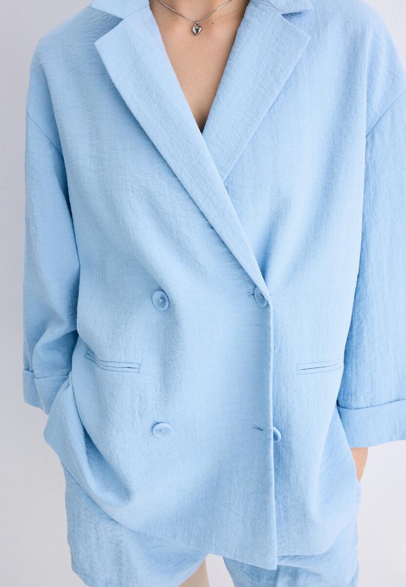 Volné sako s klopovým límcem do V a dlouhými rukávy. S předními kapsami a dvouřadým zapínáním na knoflíky. K dispozici v několika barvách.