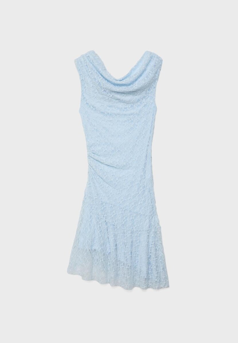 Šaty s lodním výstřihem, bez rukávů. Asymetrický lem. Podšívka v tónu. Nařasený detail na boku.