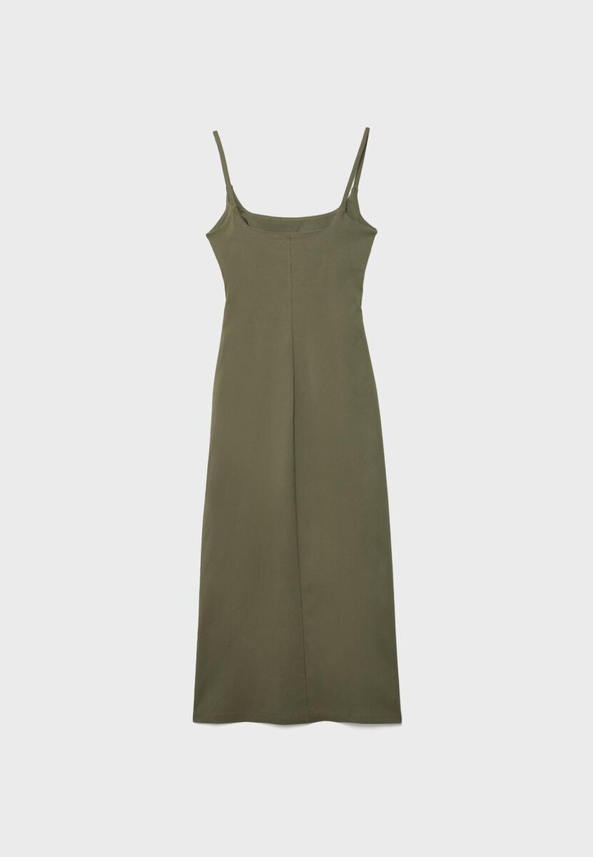 Midi šaty z bengalínu s čtvercovým výstřihem a ramínky. S řasenými detaily po stranách a rozparkem vpředu.