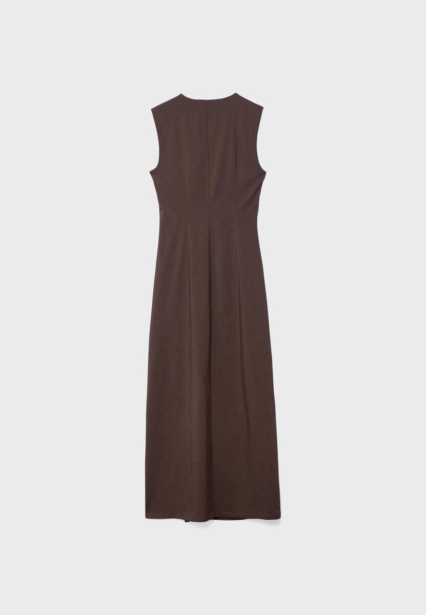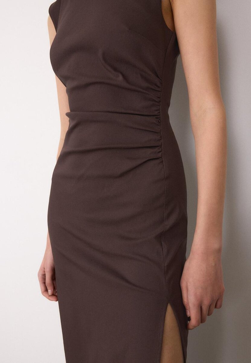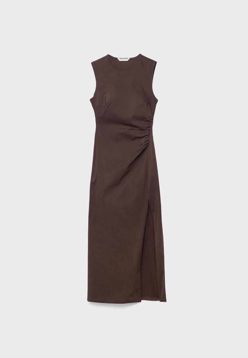 Přiléhavé midi šaty z bengalínové tkaniny. Mají kulatý výstřih a bezrukávový střih. S řaseným detailem na boku a rozparkem na spodním lemu. K dispozici v několika barvách.