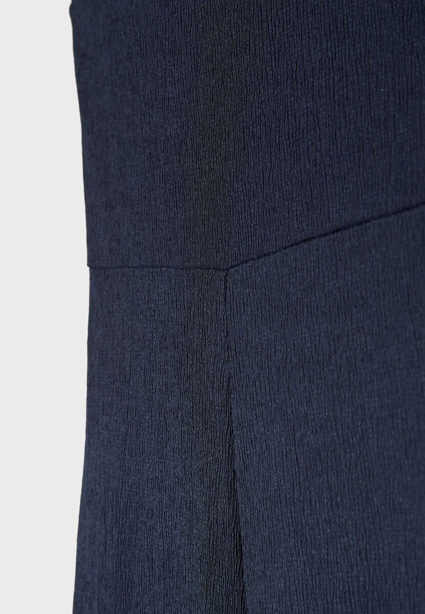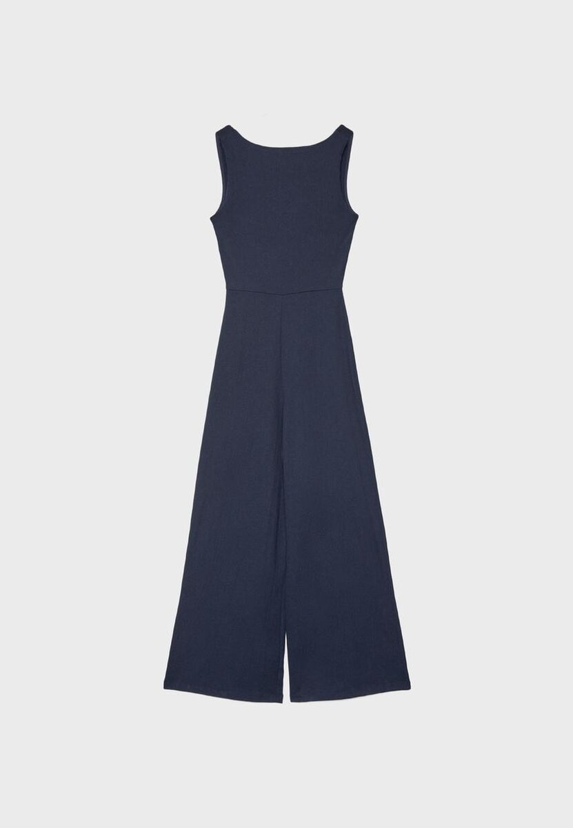 Dlouhá kombinéza se širokými nohavicemi a přiléhavým žebrovaným topem. S lodním výstřihem, bez rukávů a se švem v pase.