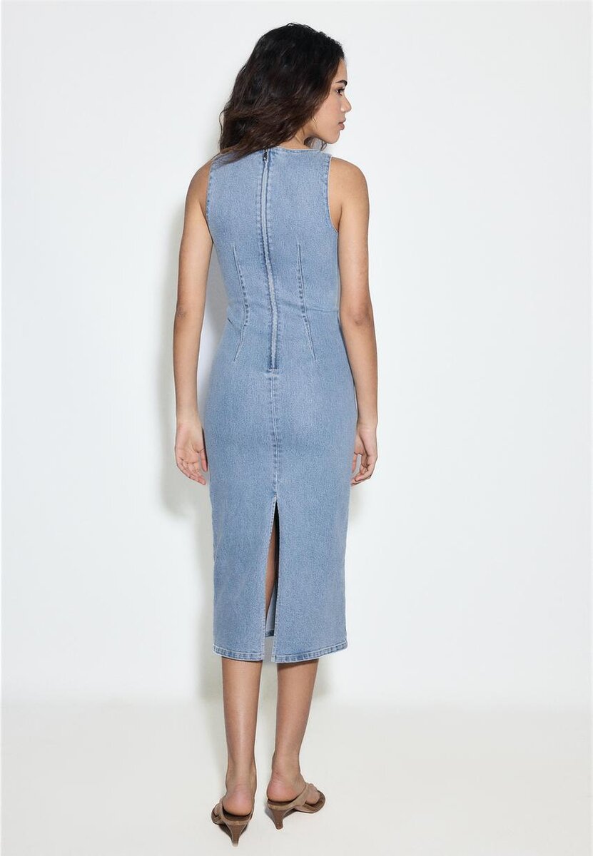 Džínové midi šaty se čtvercovým výstřihem a širokými ramínky. Zapínání na zip vzadu.