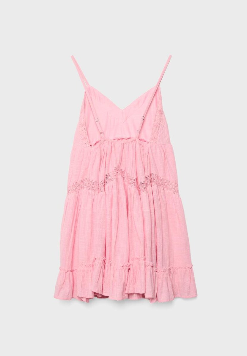 Krátké šaty z bavlněné tkaniny. Výstřih do V a tenká ramínka. Střih s panely a vsazenou krajkovou lemovkou. Volánkový lem. Vnitřní podšívka. K dispozici v několika barvách.