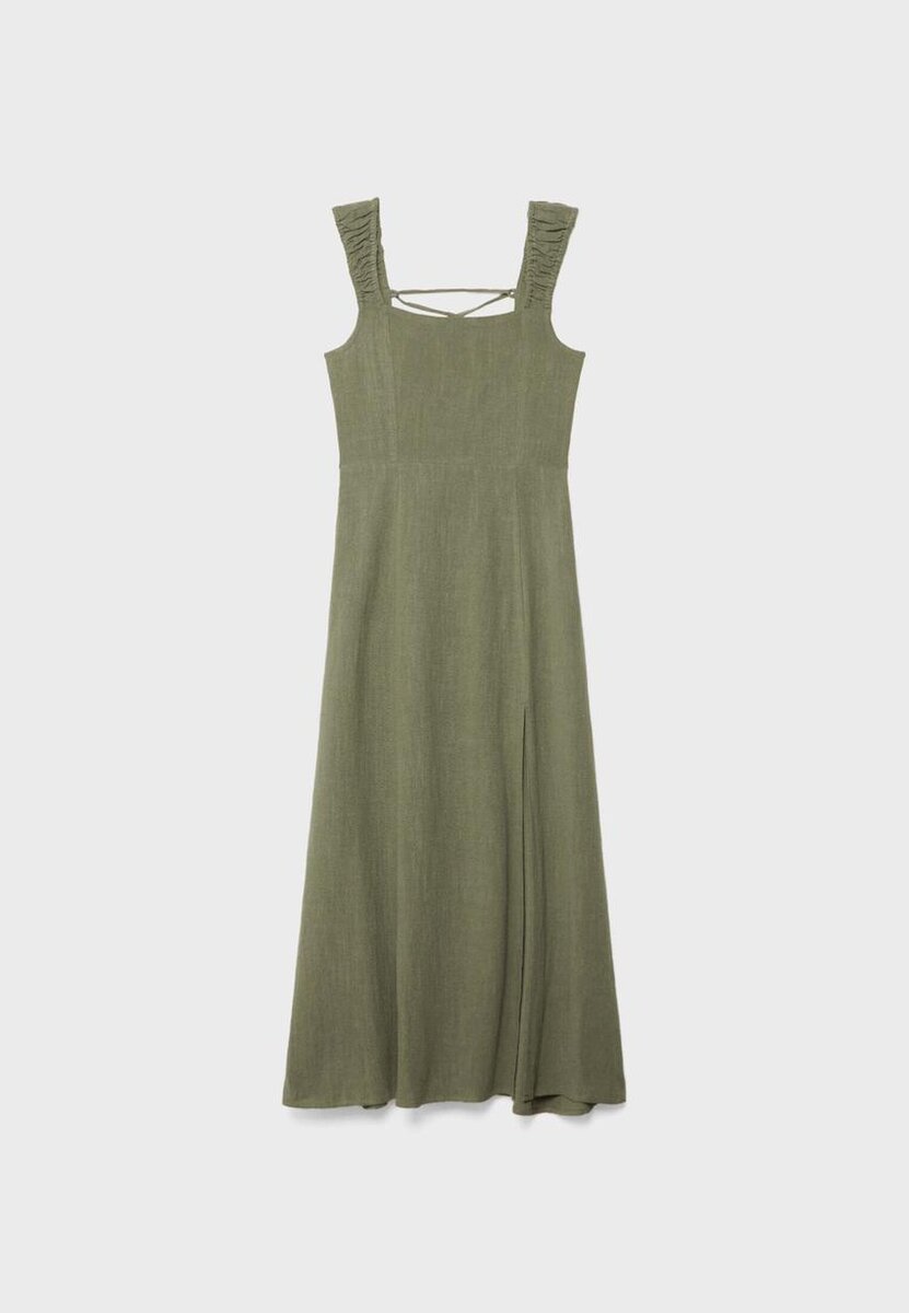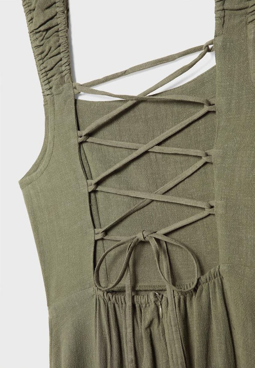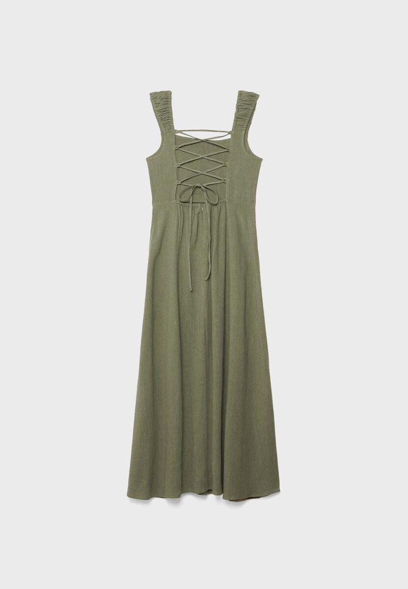 Vlající midi šaty z látky v lněném vzhledu. S rovným výstřihem a elastickými ramínky s řaseným detailem. Otevřená záda s nastavitelnými kříženými ramínky a zavazováním. Skrytý zip na zadní straně. K dispozici v několika barvách.