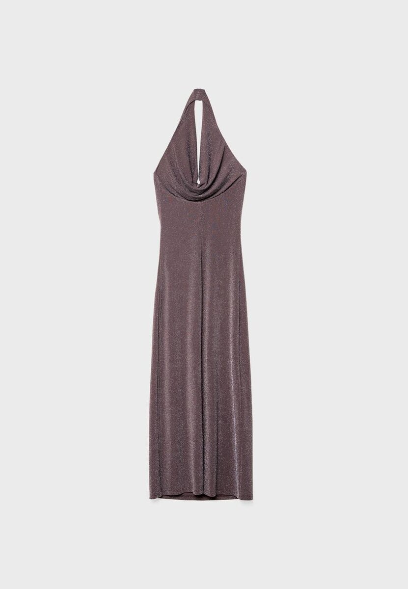 Midi šaty z elastického materiálu s detaily z metalických nití. S výstřihem do V a halter výstřihem s odhalenými zády a rameny. Volný střih se ladně vlní v pohybu a zároveň jemně zdůrazňuje siluetu.