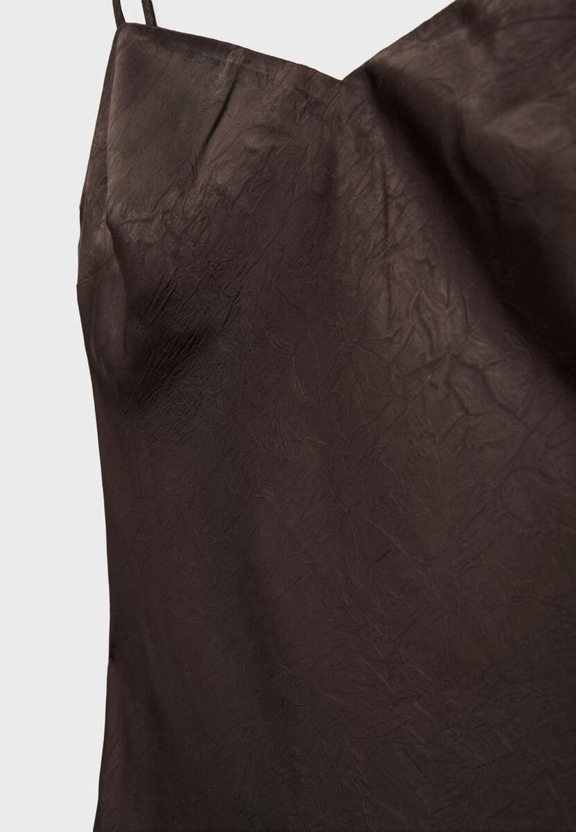 Saténové midi šaty s výstřihem do srdce a tenkými ramínky. S kříženým detailem na zádech.