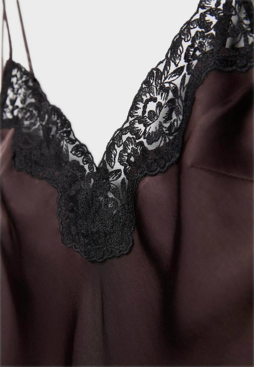 Midi šaty z saténové látky. S výstřihem do V s krajkovou aplikací a tenkými ramínky. Rovný střih. Jednoduchý lem.