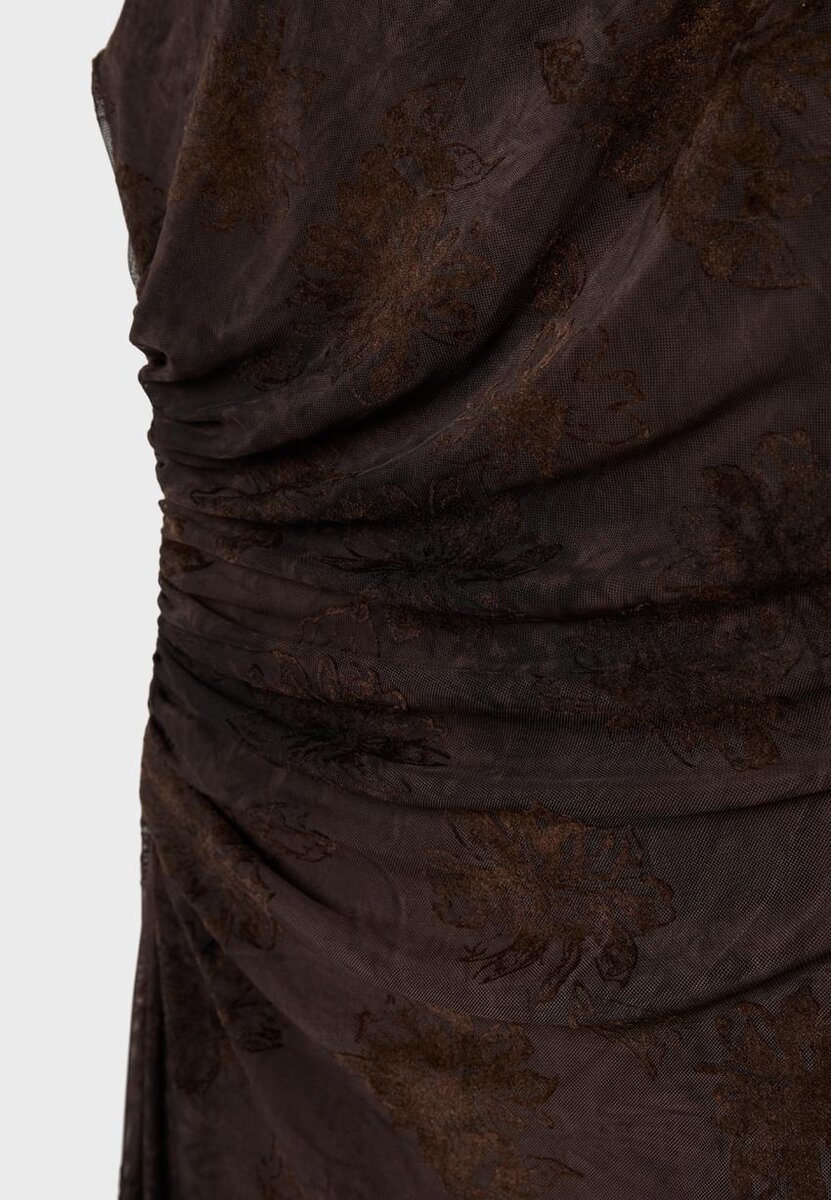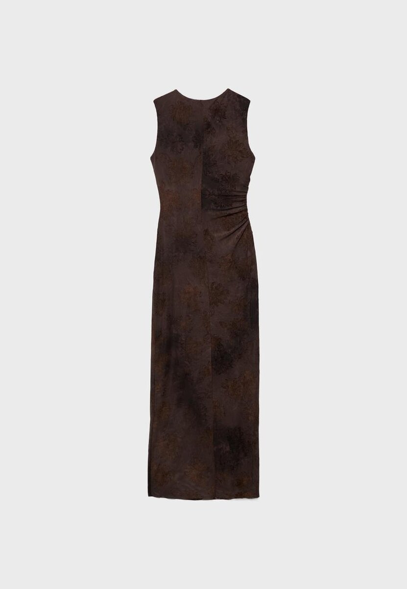 Midi šaty z potištěného tylu. Čtvercový výstřih a bez rukávů. Na boku nařasený detail. Sladěná podšívka.