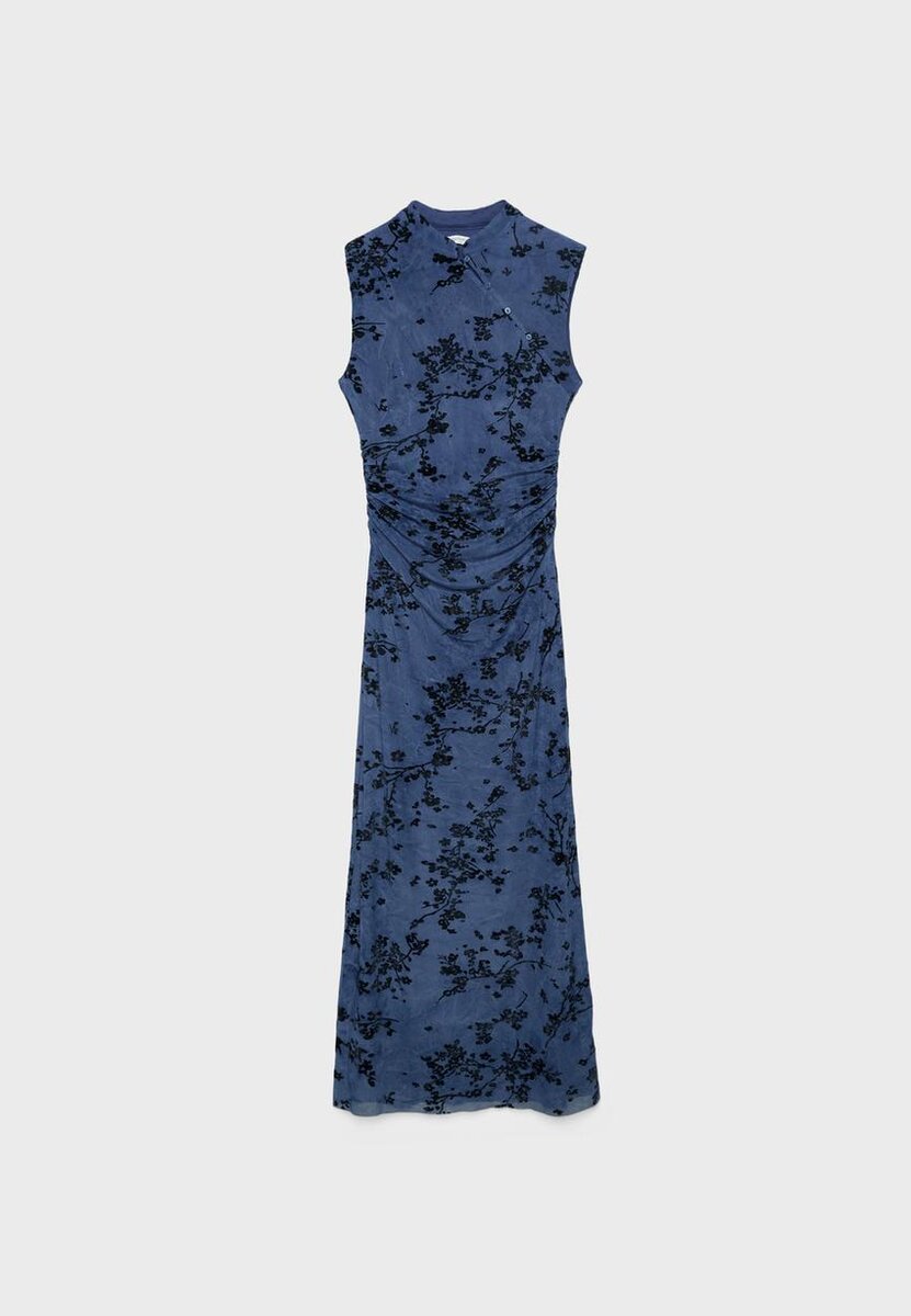 Midi šaty z potištěného tylu. Mají výstřih ve stylu qipao a bezrukávový střih. Na bocích jsou řasené detaily. Podšívka v barvě šatů.