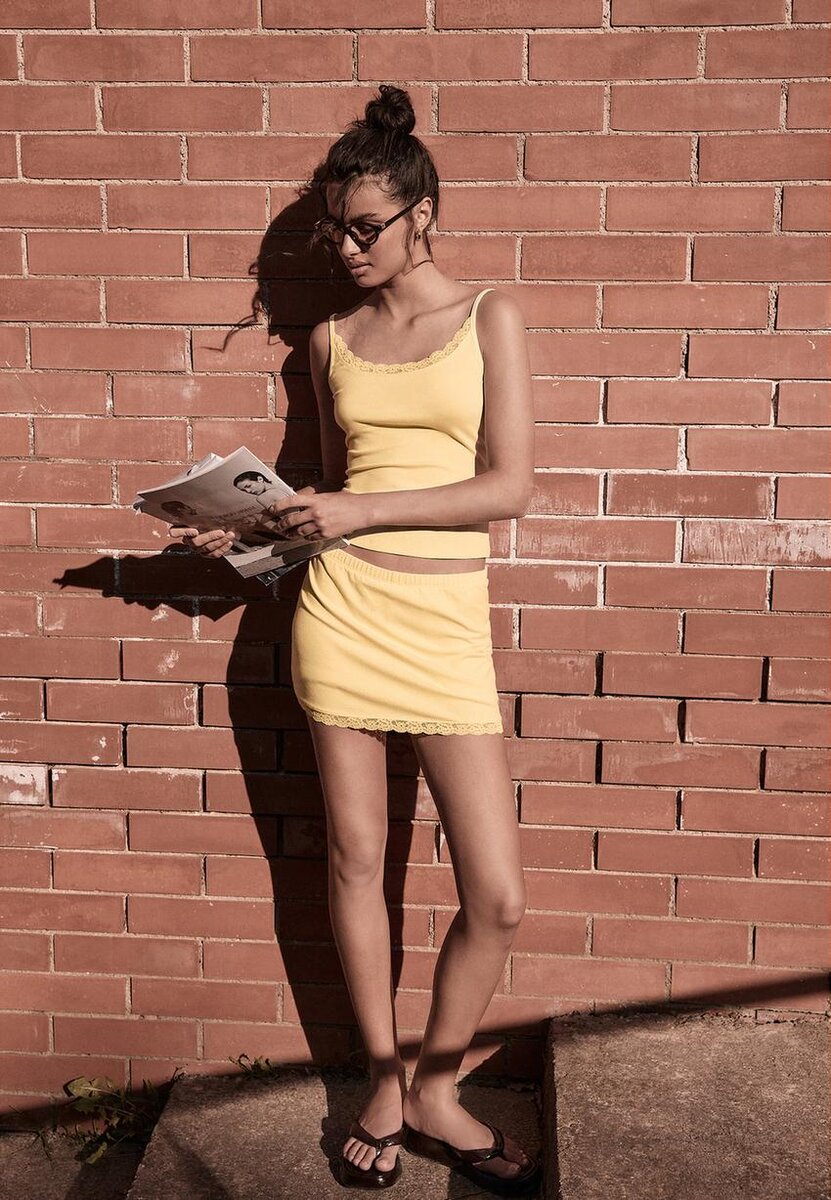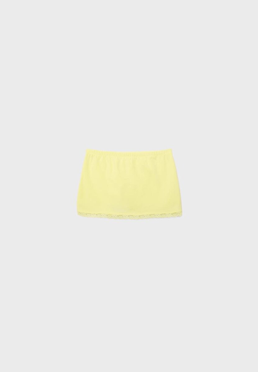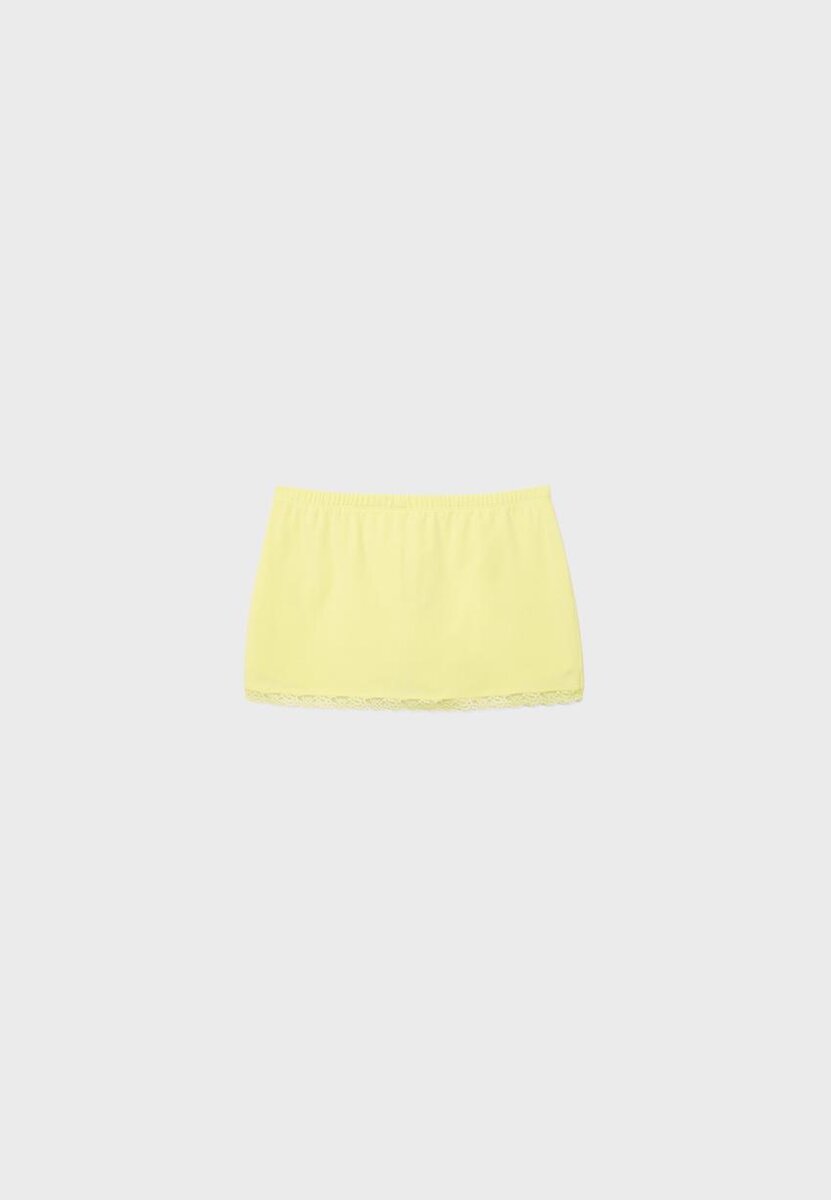 Skort s elastickým pasem a krajkovým lemem. Vnitřní kraťasy ve stejné barvě. K dispozici v různých barvách.