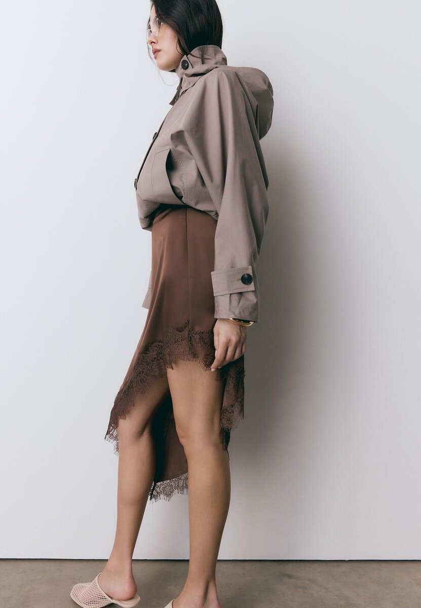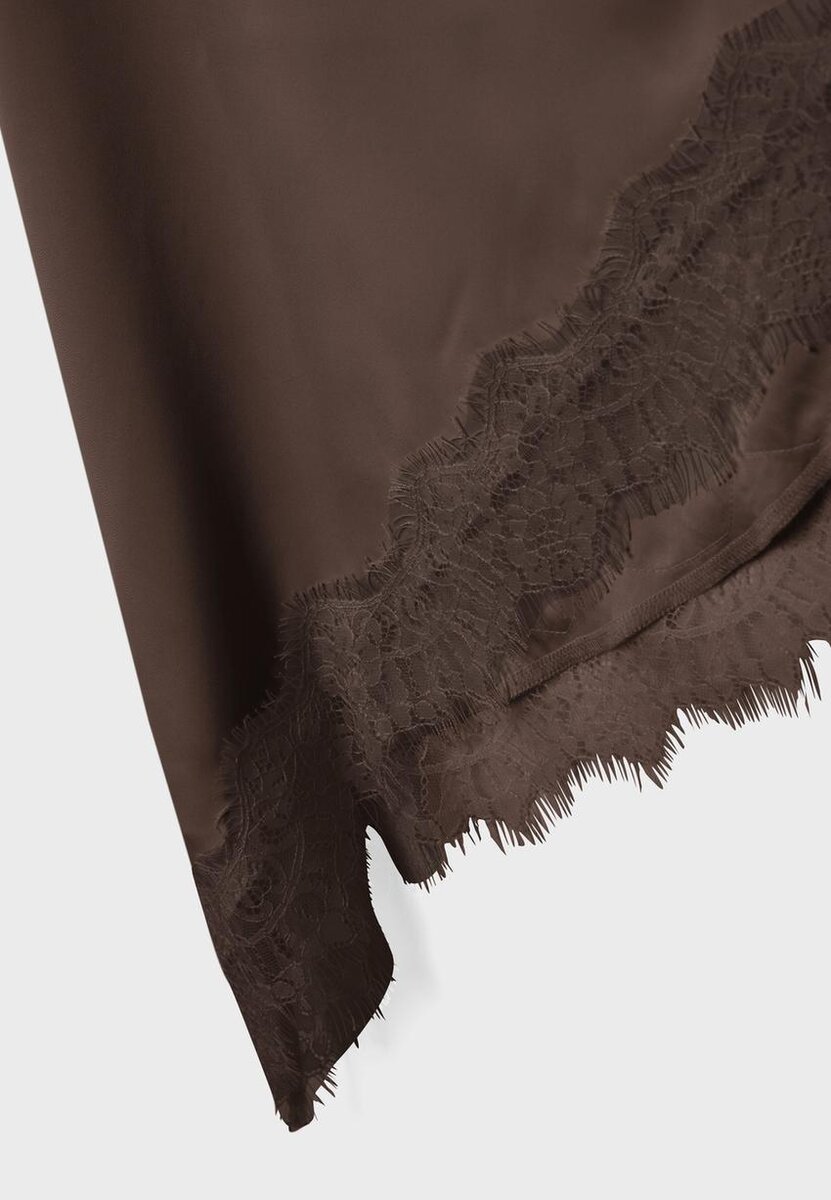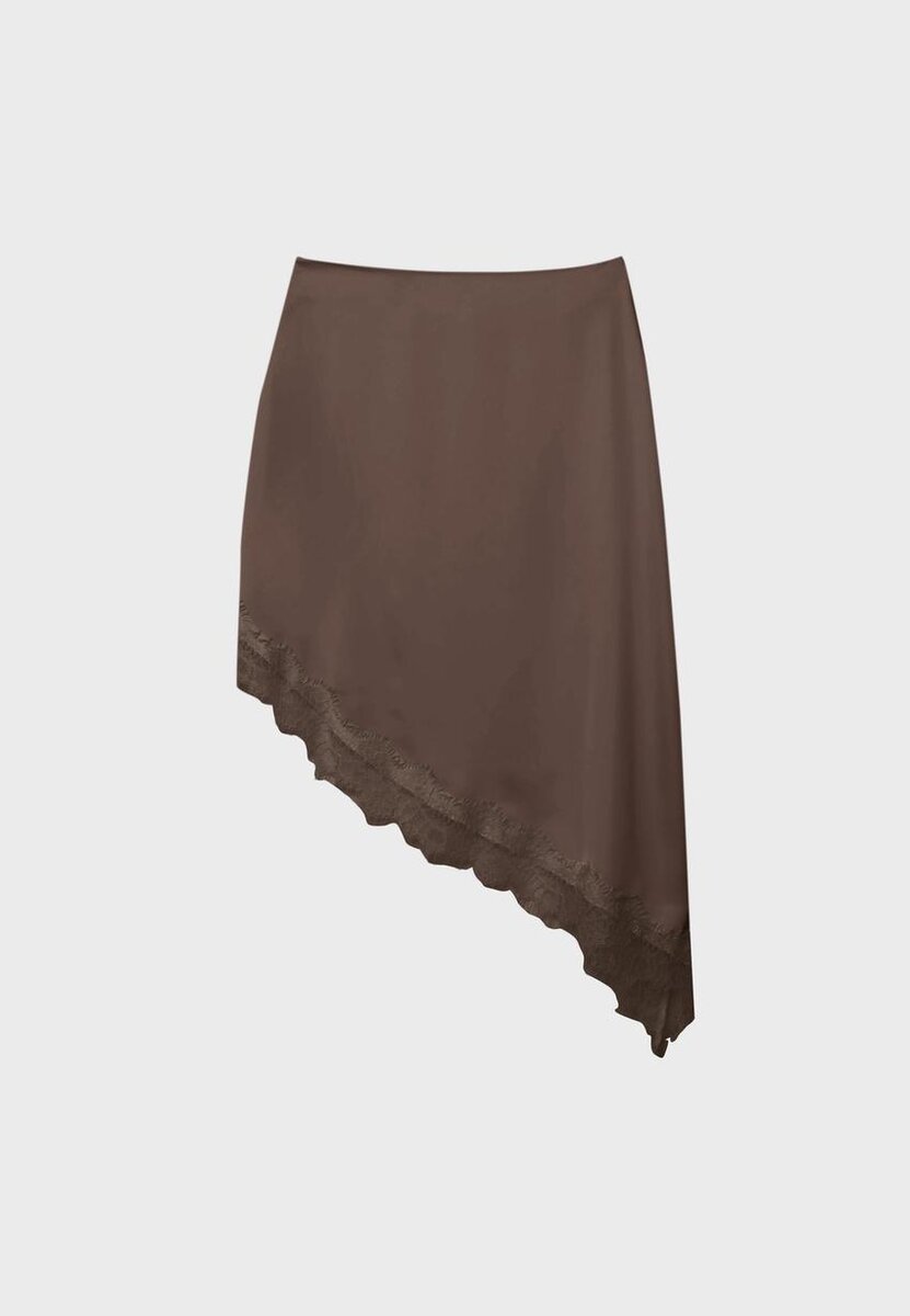 Midi sukně se středním pasem z látky se saténovým efektem. Asymetrický lem s krajkovým lemováním. K dispozici v různých barvách.