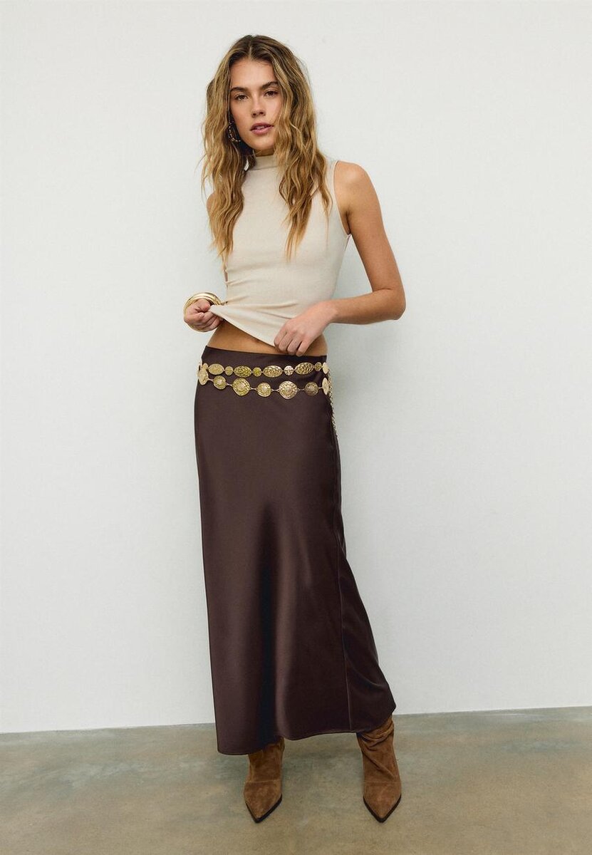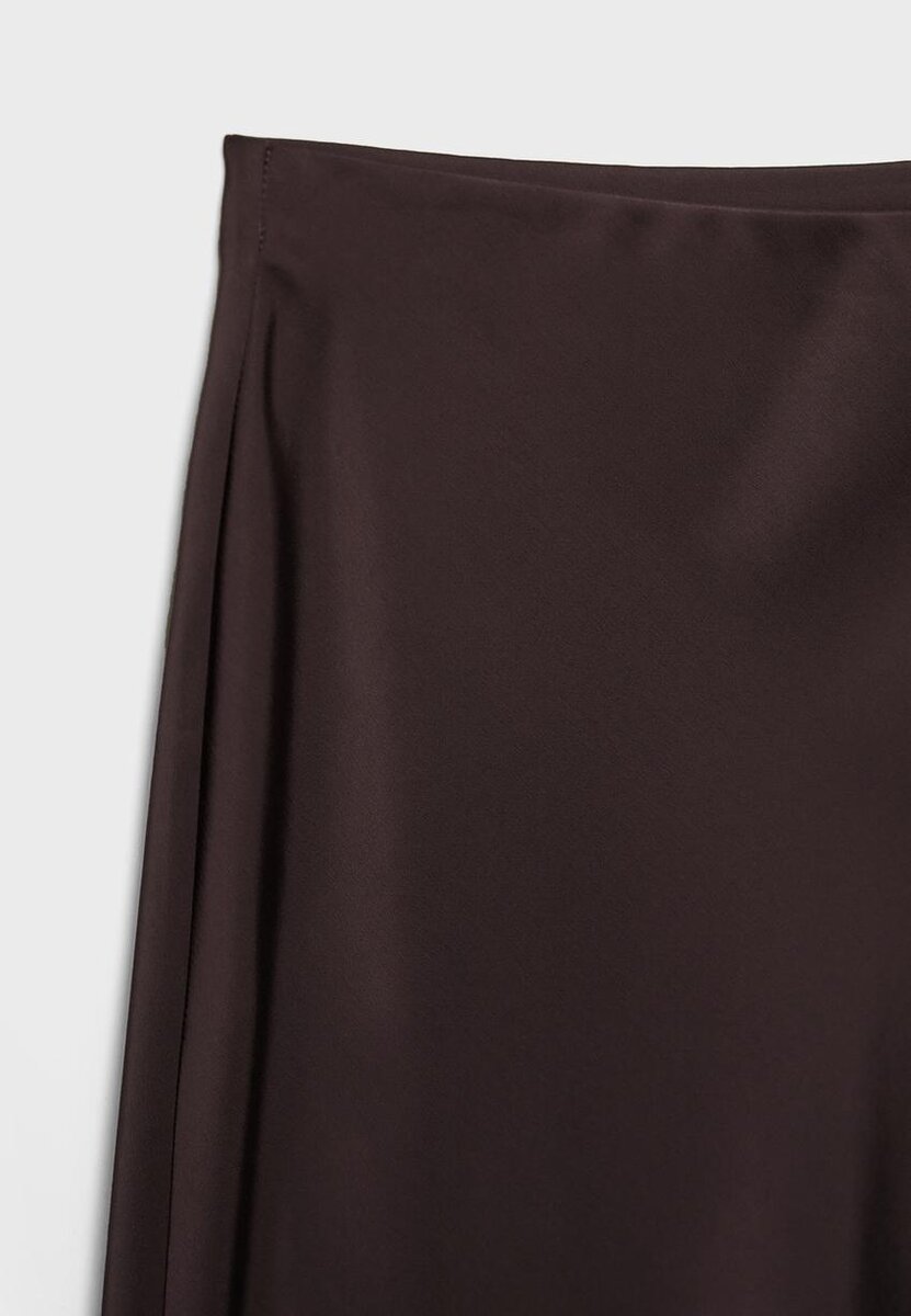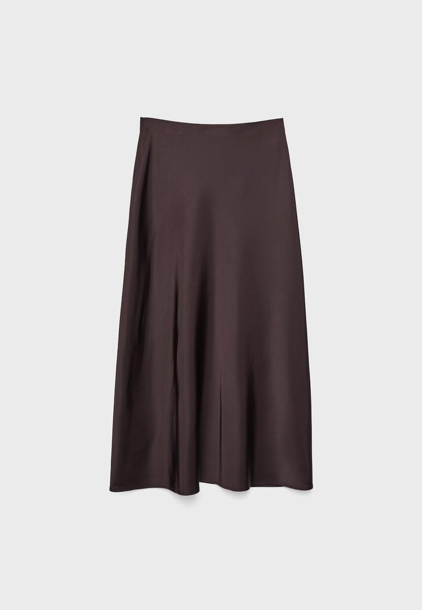 Midi sukně se středním pasem vyrobená z látky se saténovým efektem. K dispozici v několika barvách.