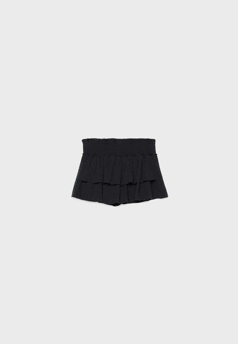 Vlající Skort se středně vysokým pasem a elastickým smockovaným pasem. Sladěný vyšívaný detail. Volný lem s volánky. K dispozici v různých barvách.