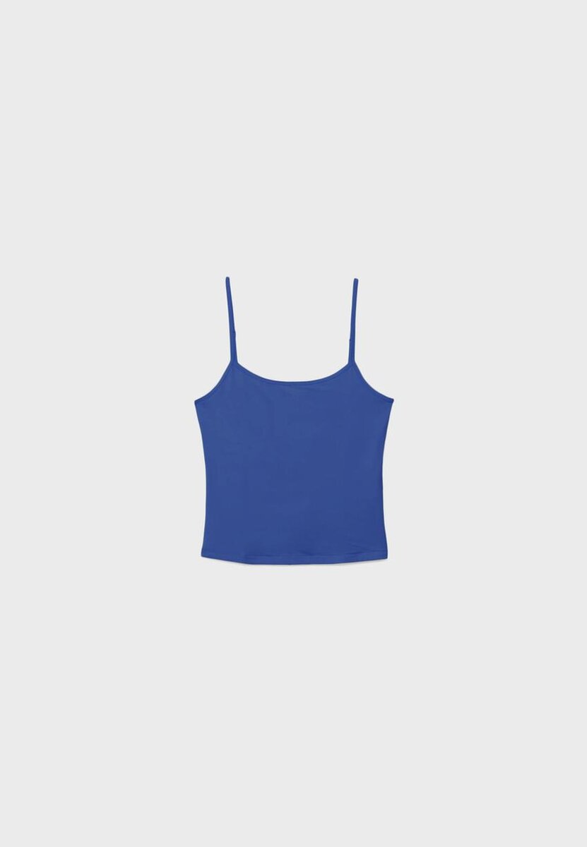Přiléhavé tílko s kulatým výstřihem a tenkými nastavitelnými ramínky. K dispozici v několika barvách.