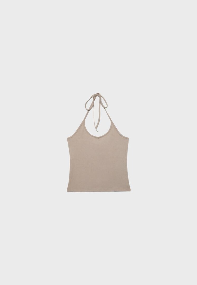 Přiléhavý top s vázáním za krkem. Má tenké nastavitelné vázací ramínka a otevřená záda.