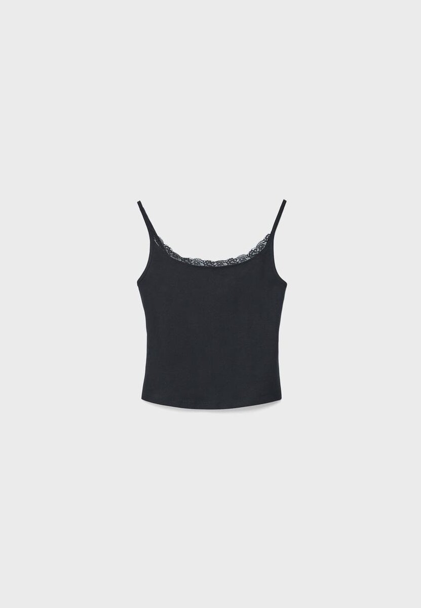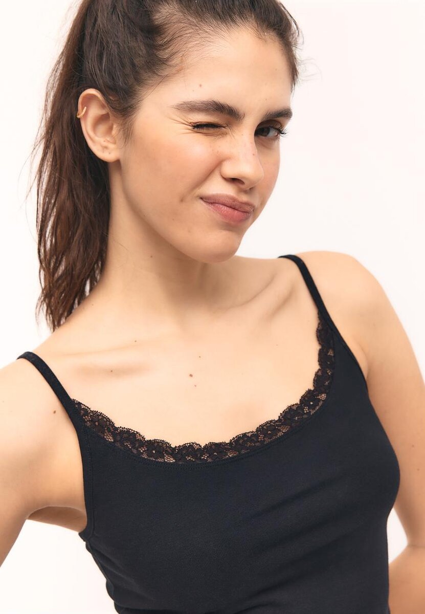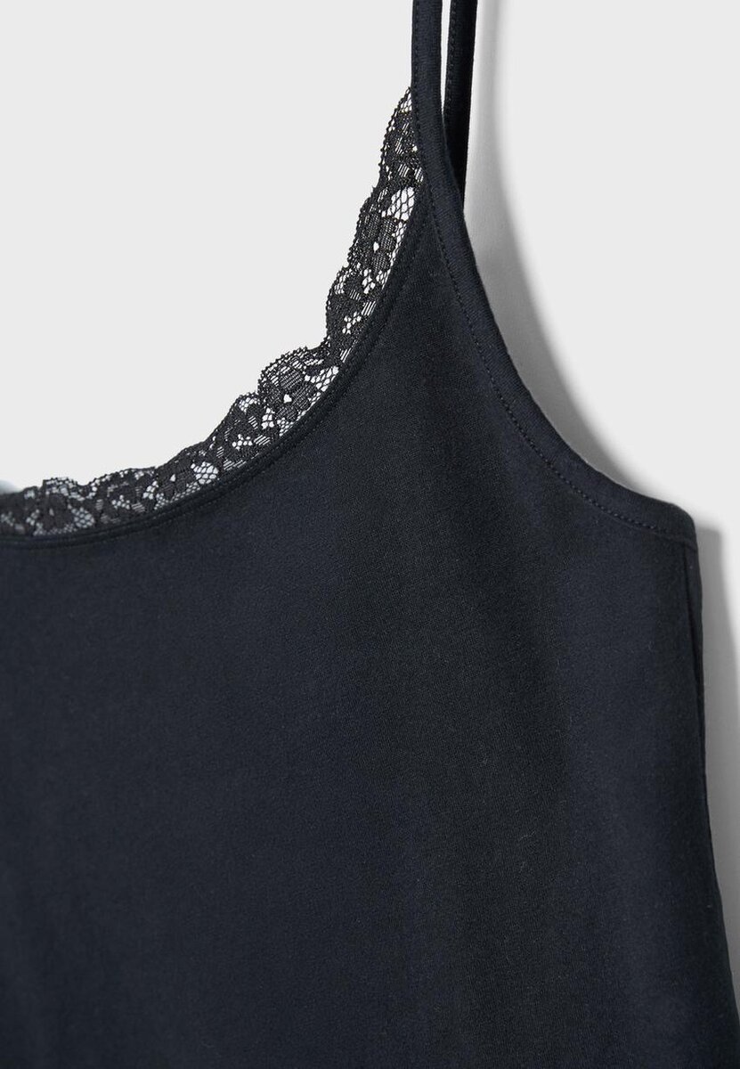 Přiléhavý top s kulatým výstřihem a tenkými ramínky, zdobený krajkovými detaily. K dispozici v různých barvách.