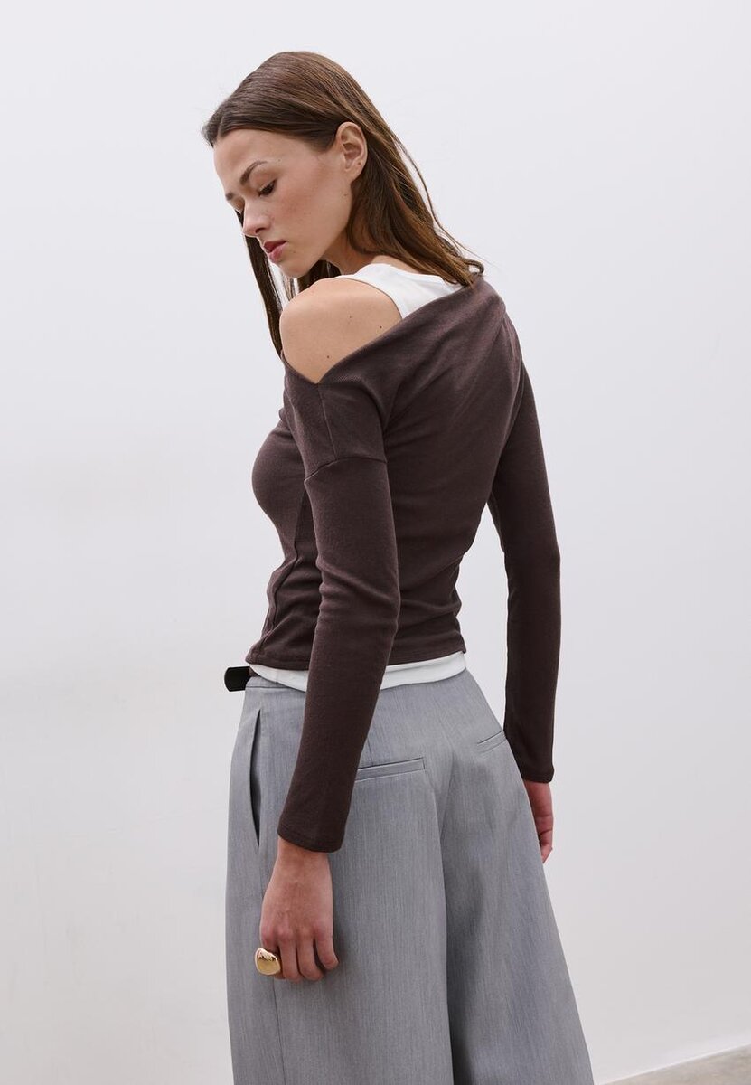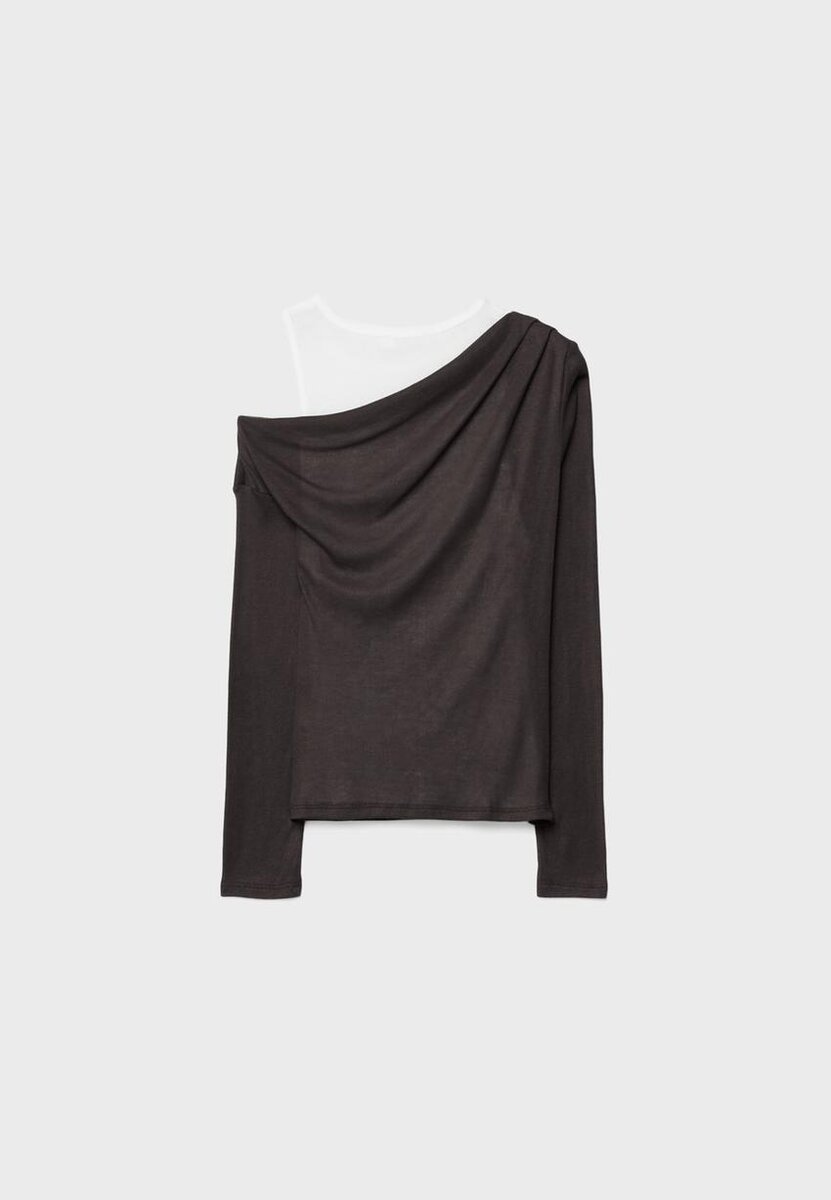 Kombinované tričko s drapovaným asymetrickým výstřihem a dlouhými rukávy. Obsahuje kontrastní vnitřní tričko s kulatým výstřihem a ramínky na zádech. K dispozici v několika barvách.
