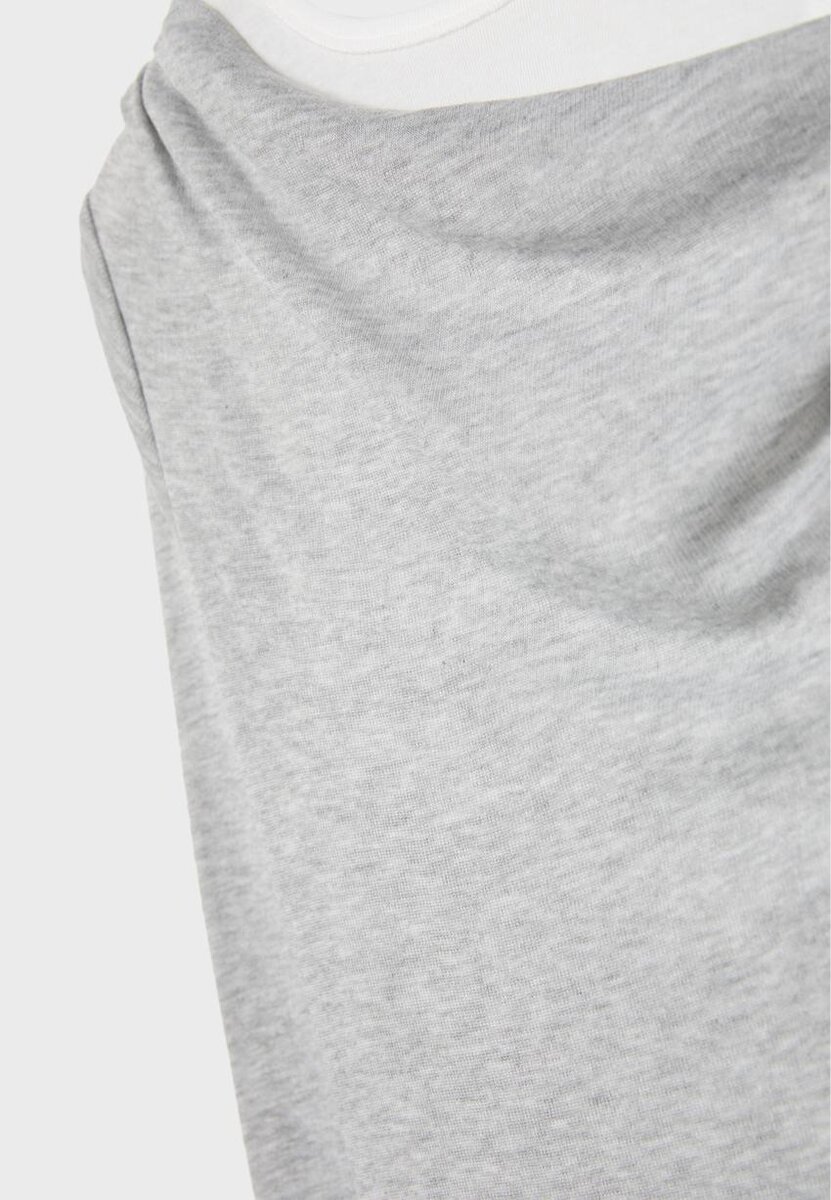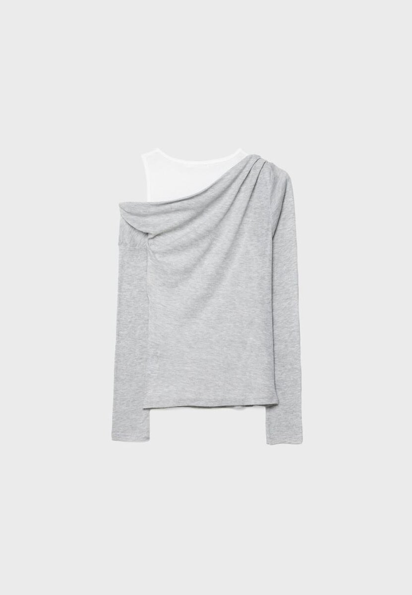 Kombinované tričko s drapovaným asymetrickým výstřihem a dlouhými rukávy. Obsahuje kontrastní vnitřní tričko s kulatým výstřihem a ramínky na zádech. K dispozici v několika barvách.