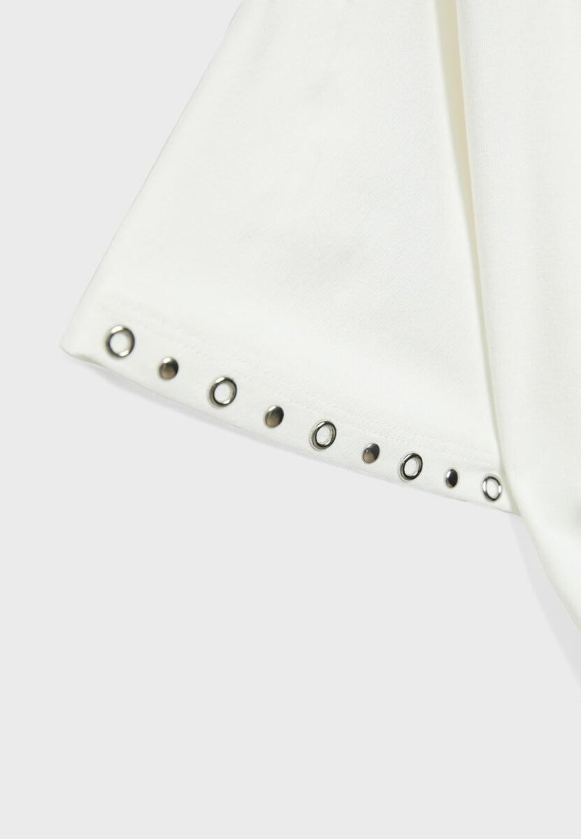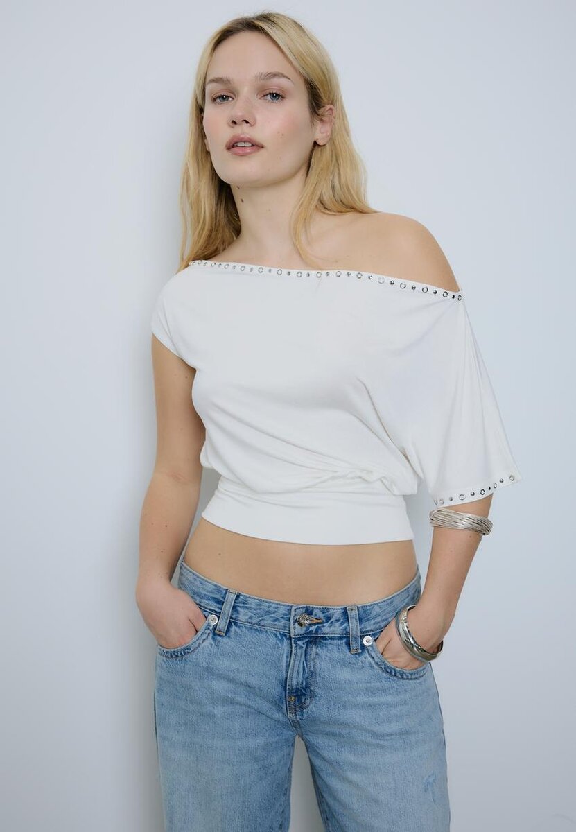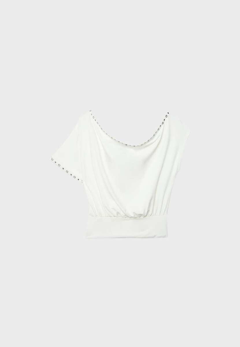 Tričko s asymetrickým výstřihem a krátkými rukávy. Přiléhavý spodní lem. Detaily s cvočky. K dispozici v několika barvách.