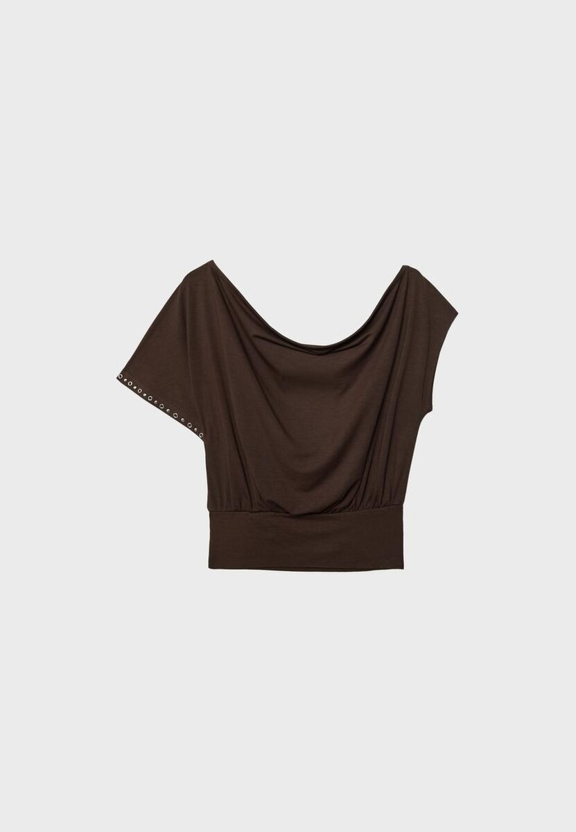 Tričko s asymetrickým výstřihem a krátkými rukávy. Přiléhavý spodní lem. Detaily s cvočky. K dispozici v různých barvách.