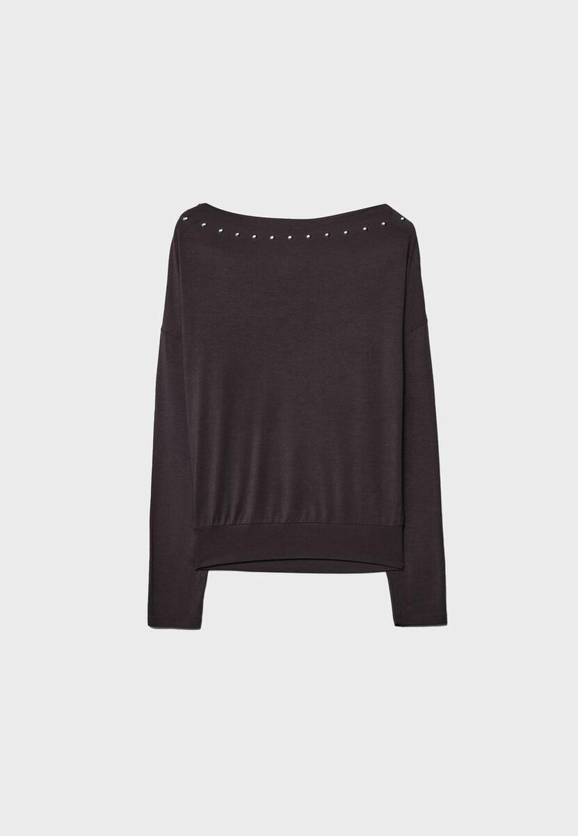 Tričko s dlouhým rukávem a asymetrickým střihem s odhaleným ramenem. Detail v podobě cvočků. K dispozici v několika barvách.